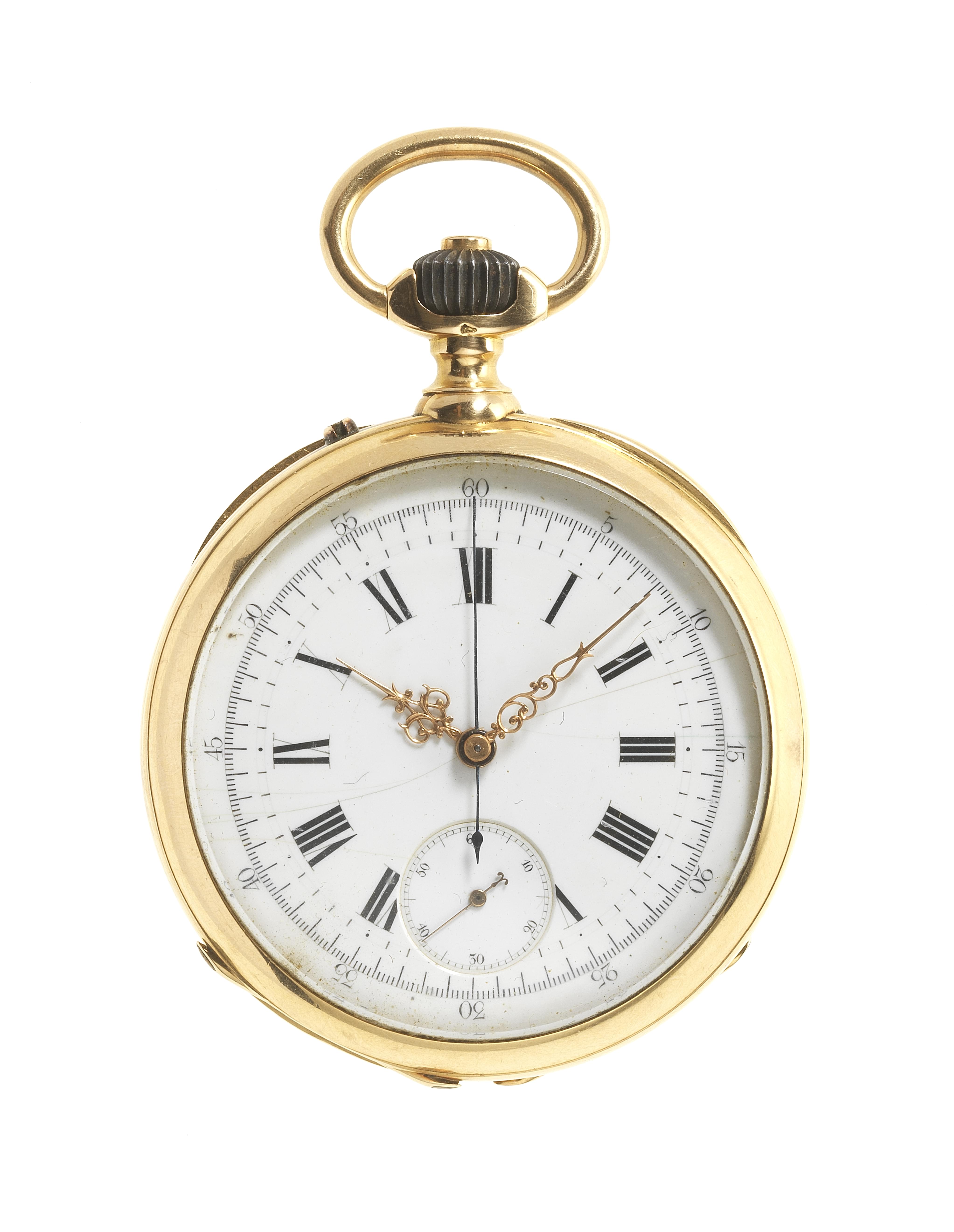 Cadran émaillé blanc, aiguilles dorées, chiffres romains noirs, secondes à 6h, aiguille du chronomètre bleue, travail français XIXe s, or 750, D 48 mm, poids brut 102 g