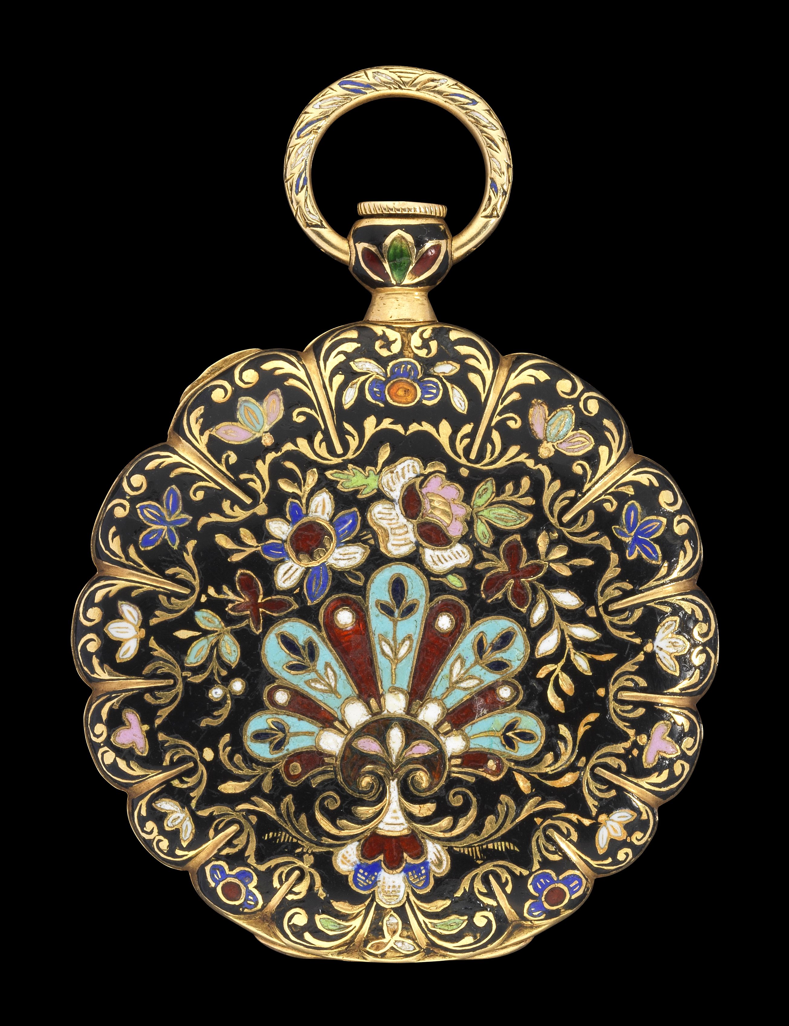 Email et argent, 7 cm. On joint une plaque à décor émaillé.