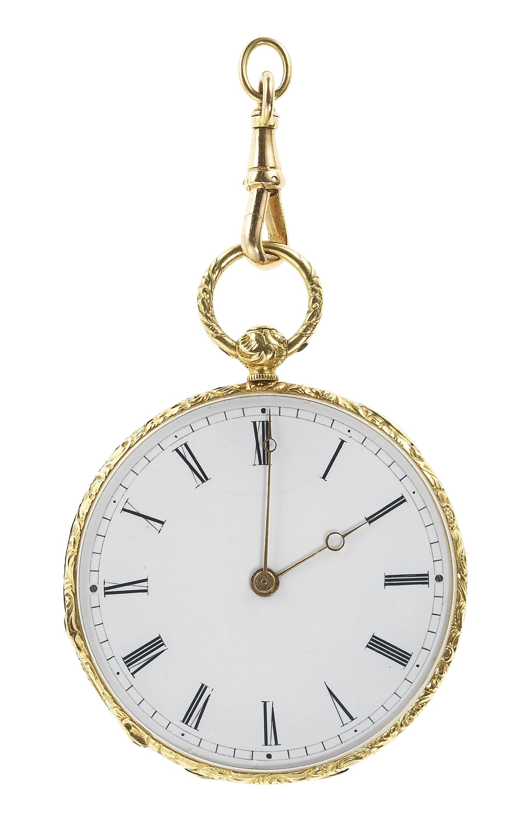 Cadran émaillé blanc, aiguilles dorées, chiffres romains noirs, travail français, or 750, D 32 mm, poids brut 21 g