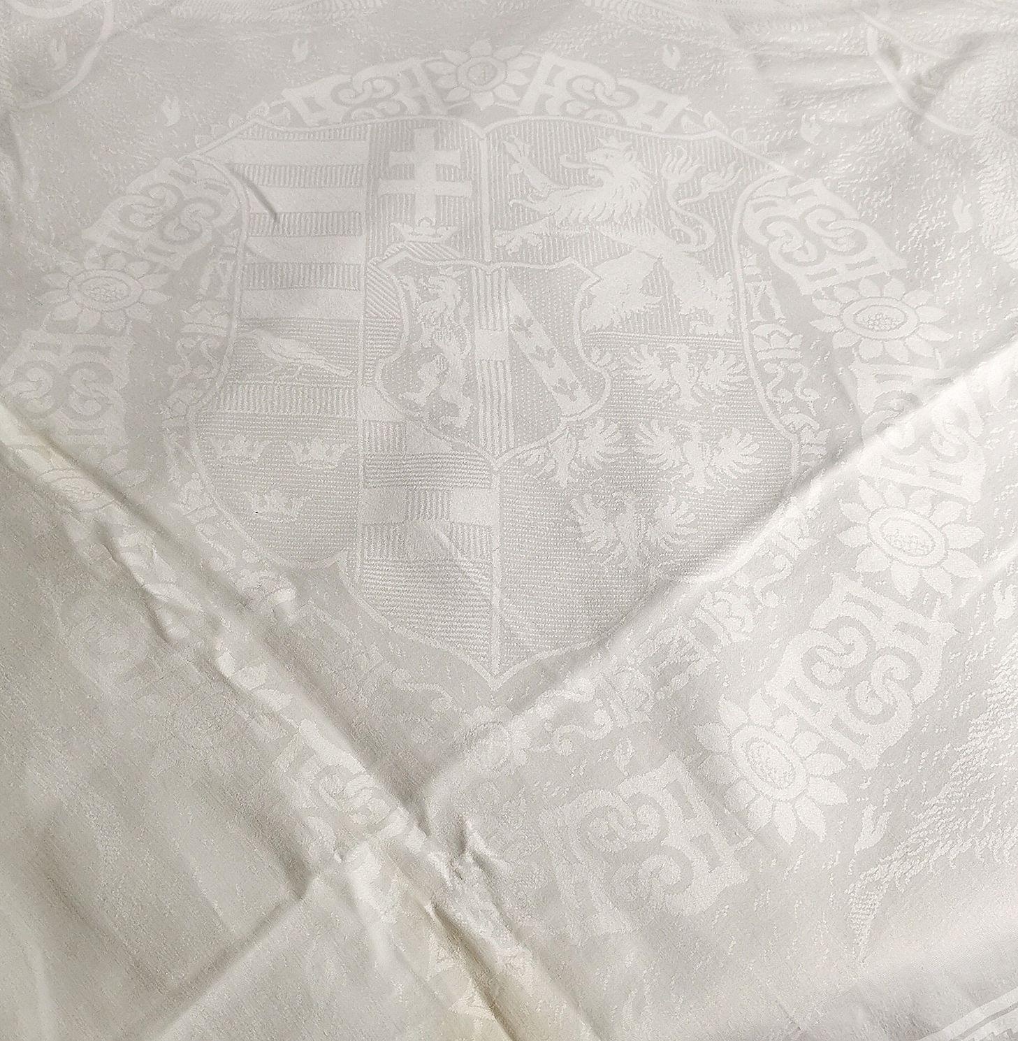 3926. Nappe à décor damassé d'un médaillon fleuri au centre et des armes de Habsbourg dans les coins, 325x300. On joint une nappe damassée de