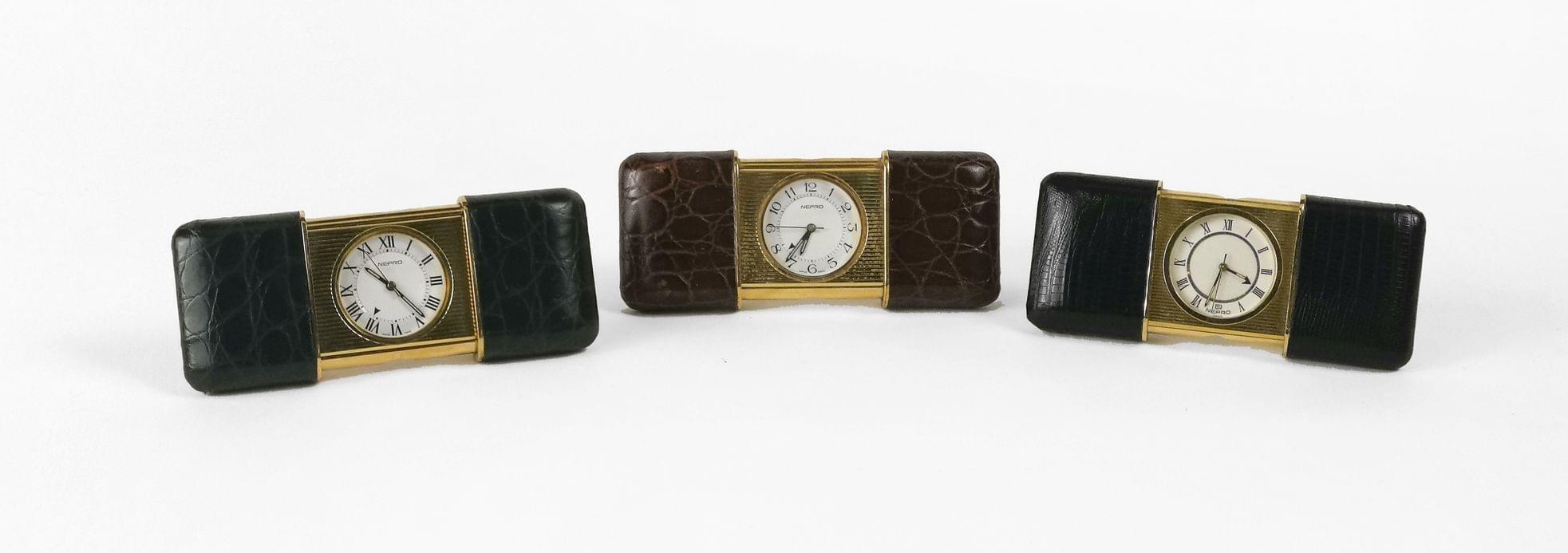 4082. Nepro Suisse, lot de trois pendulettes dans leur étui en cuir