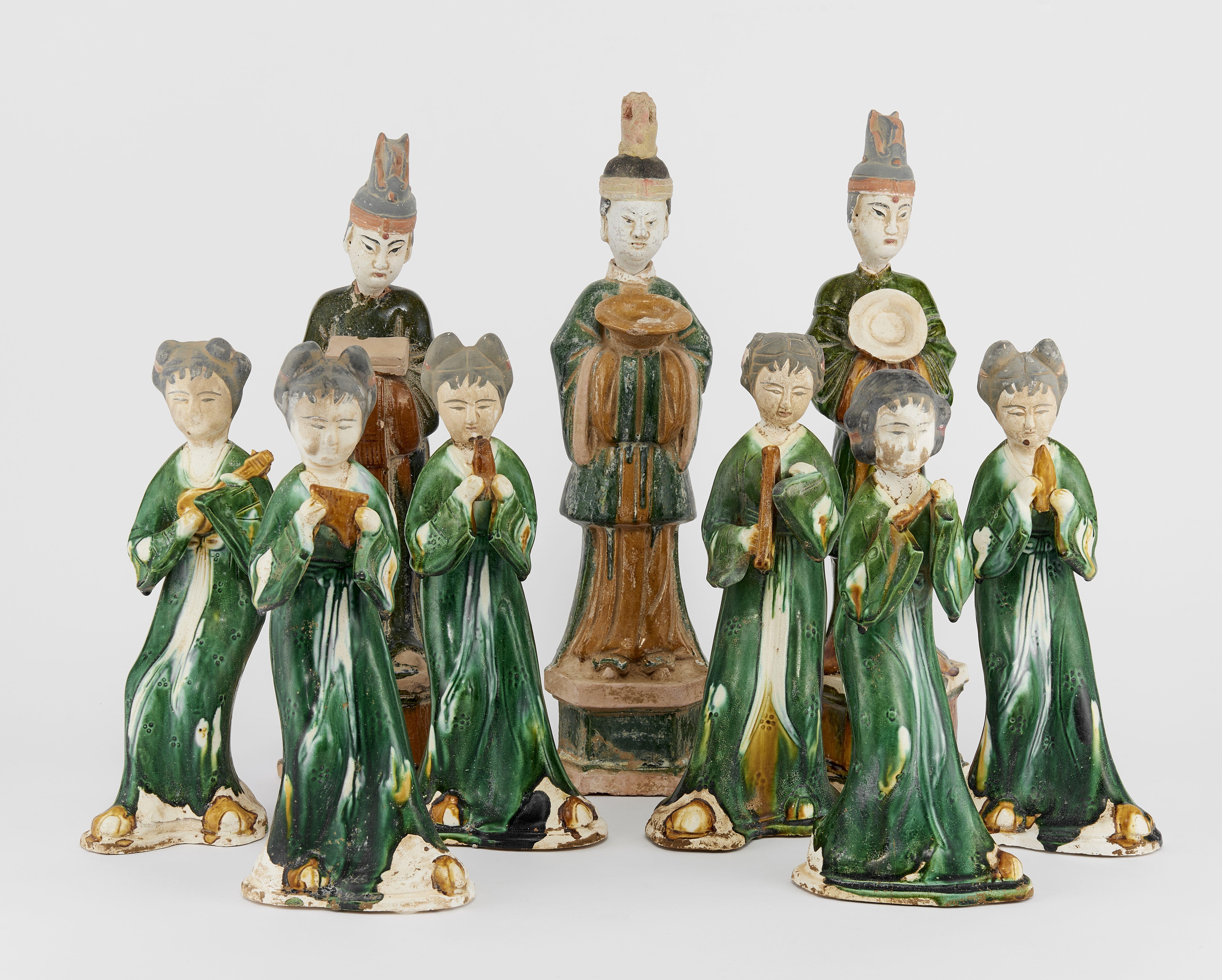 5283. Neuf statuettes de dignitaires et danseuses, Chine, dans le style Tang