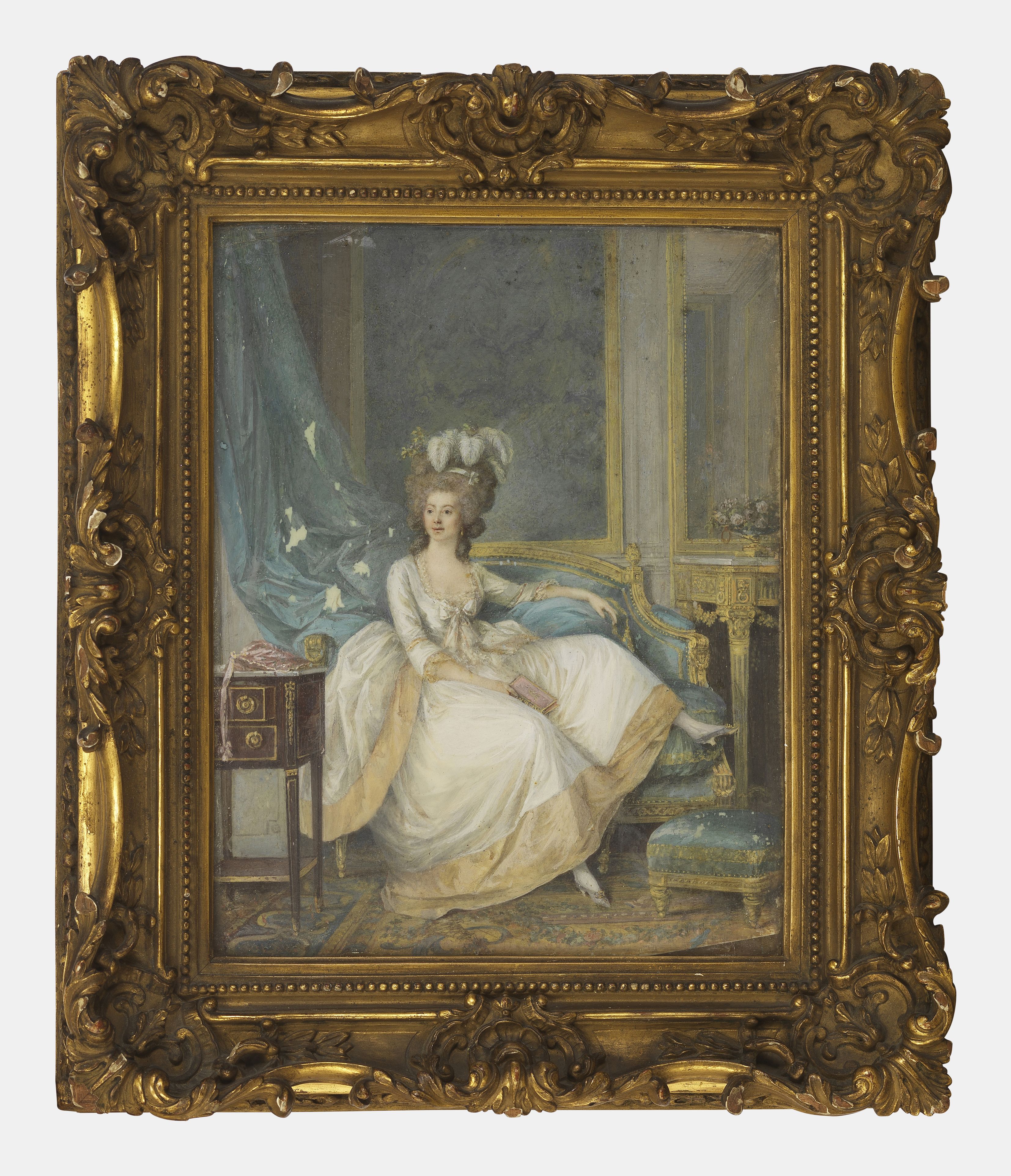 Portrait d'une dame de qualité dans son intérieur, gouache sur ivoire, signée sur la traverse de la commode à gauche, 19x15 cm. Provenance: Les Stern, une famille de collectionneurs. Pour les lots précédés d’un *, la TVA de 8,1% est due sur l’entier du prix d’adjudication.