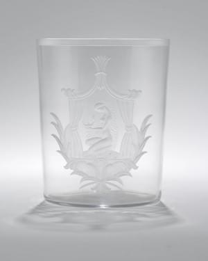 Gobelet, verre translucide à décor gravé d'une vestale tenant une lampe à huile, signé "Orrefors G 237 1927 JL", Exposé au Musée Ariana 2012, H 12 cm