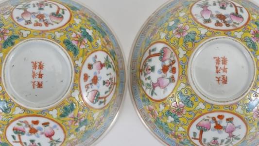 3368. Paire de bols à décor de réserves à motifs de vases de fleurs sur un fond jaune décoré de feuilles et fruits