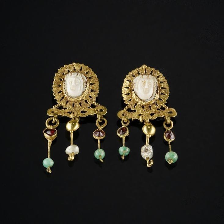1013. Paire de boucles d'oreilles en or serties de visages de méduse en camée, de style romain