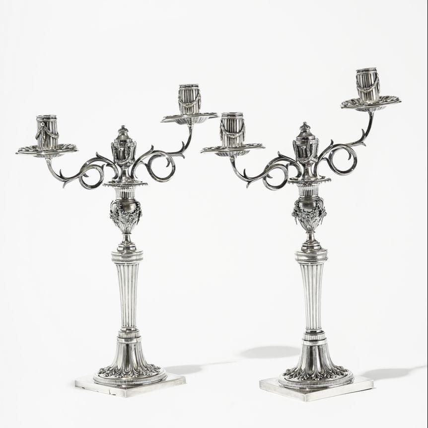 205. Paire de bougeoirs néoclassiques à décor de cannelures et guirlandes