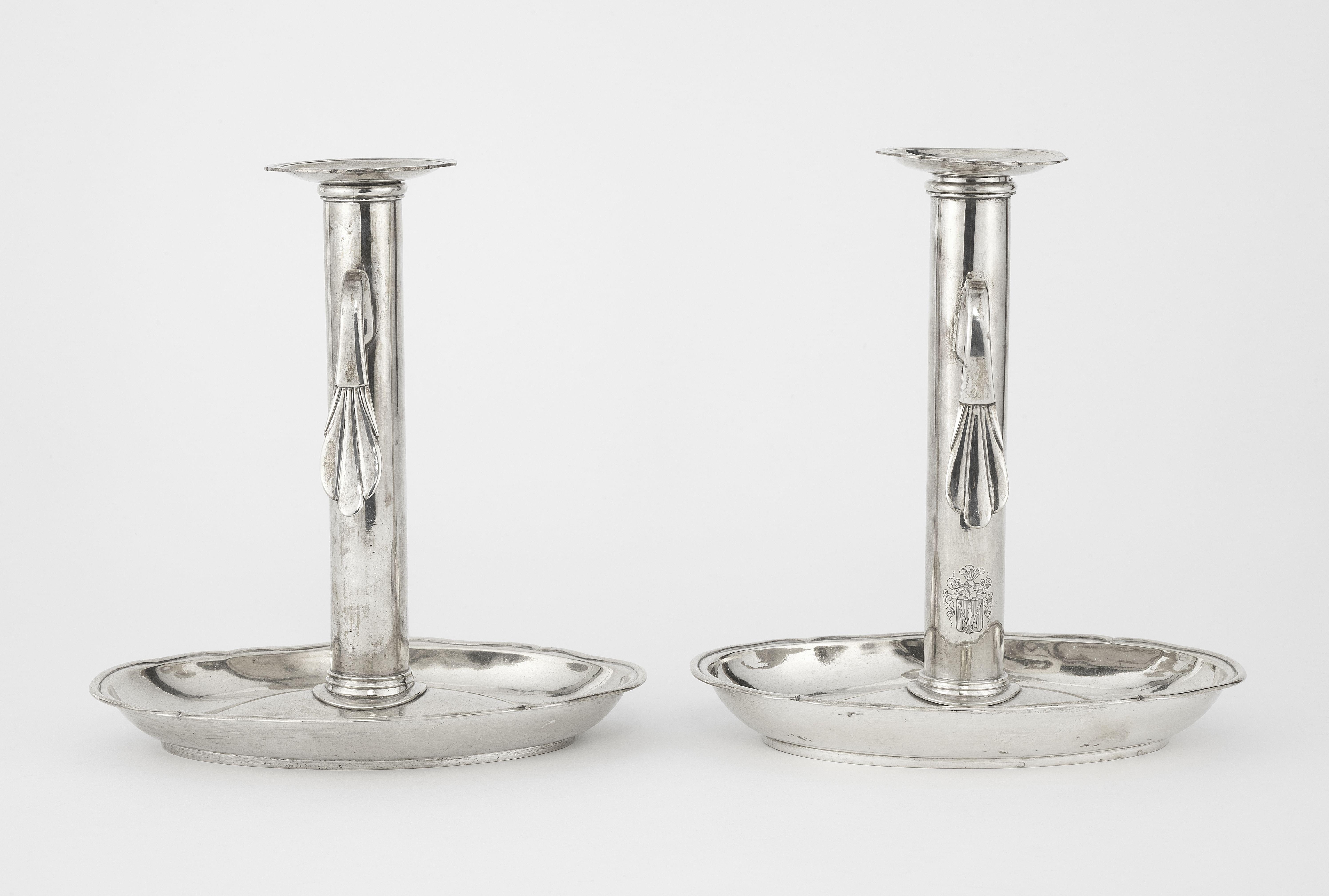 1. Paire de flambeaux à décor repoussé de larges fleurs et acanthes