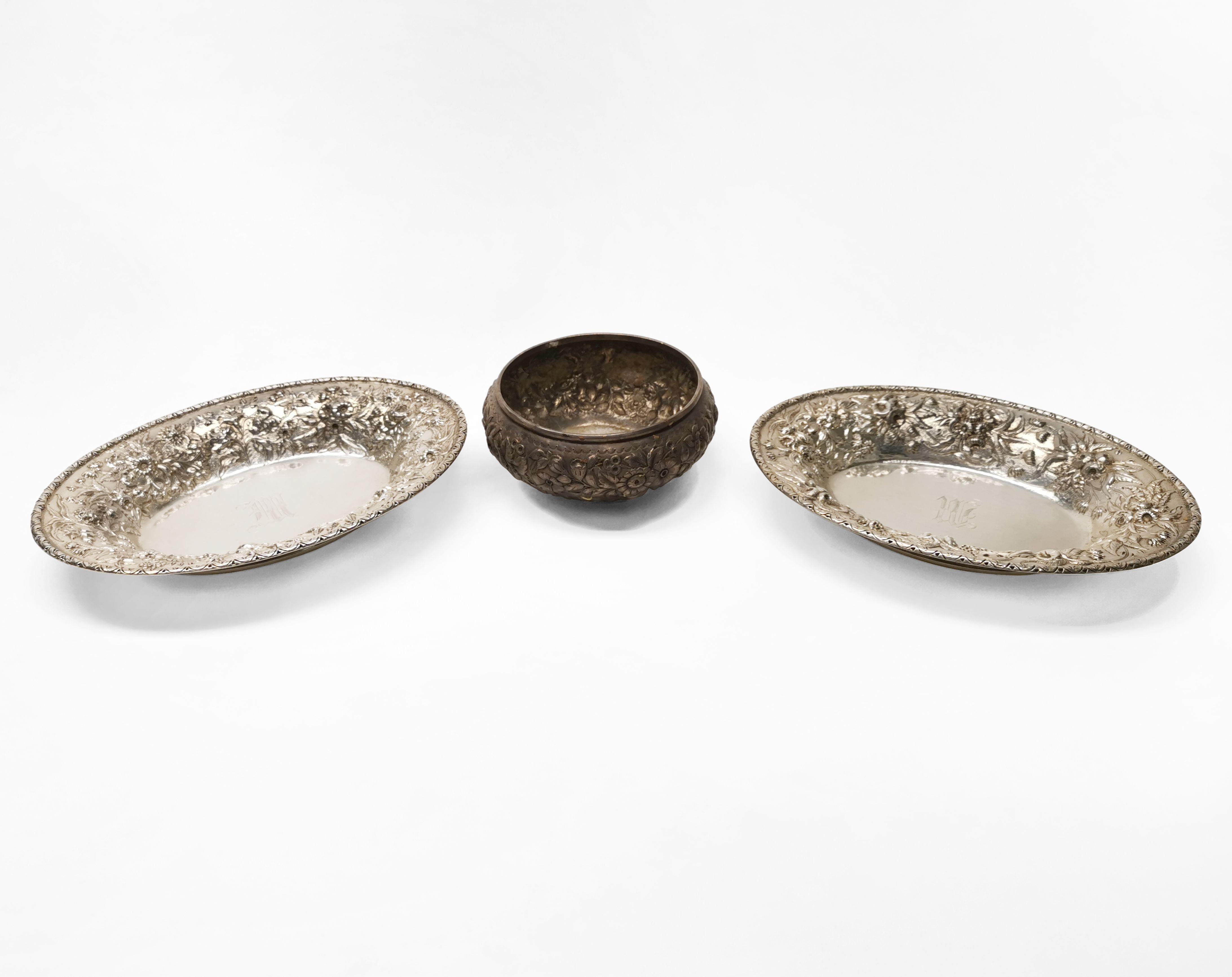3871. Paire de coupes ovales et un bol à décor repoussé de fleurs