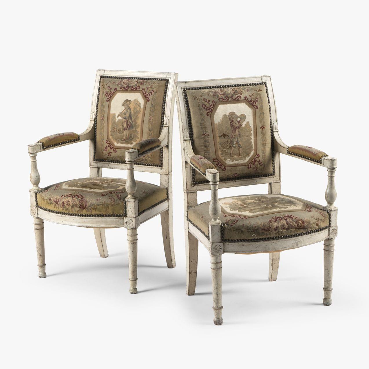 Bois laqué blanc, garniture en tapisserie d'Aubusson à décor de scène de chasse, estampille illisible