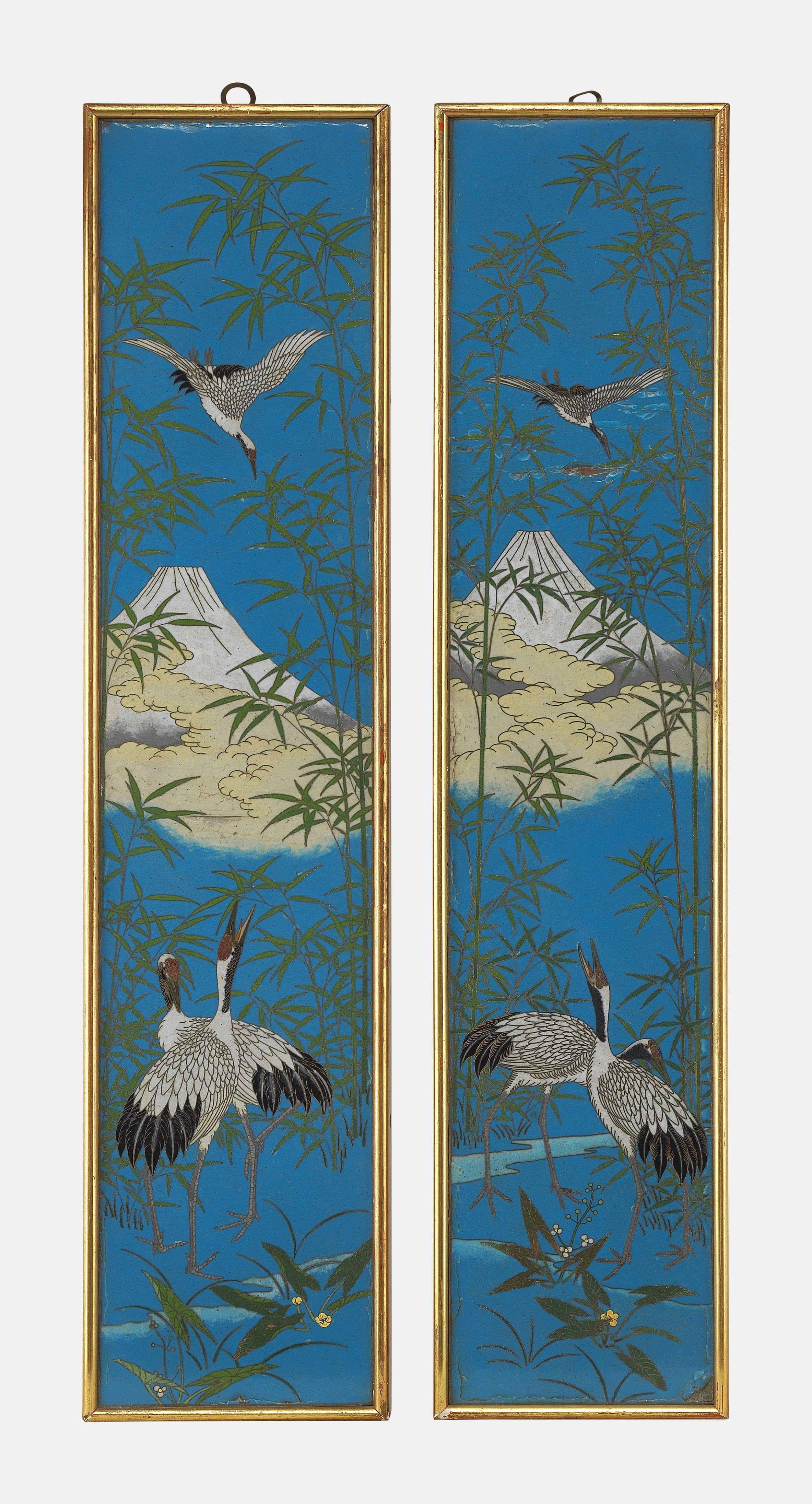 Emaux sur cuivre à décor d'oiseaux et bambous, figurant le Mont Fuji en arrière-plan, 62x13 cm