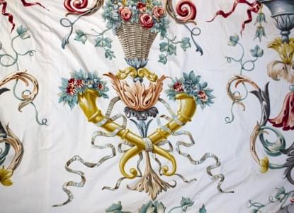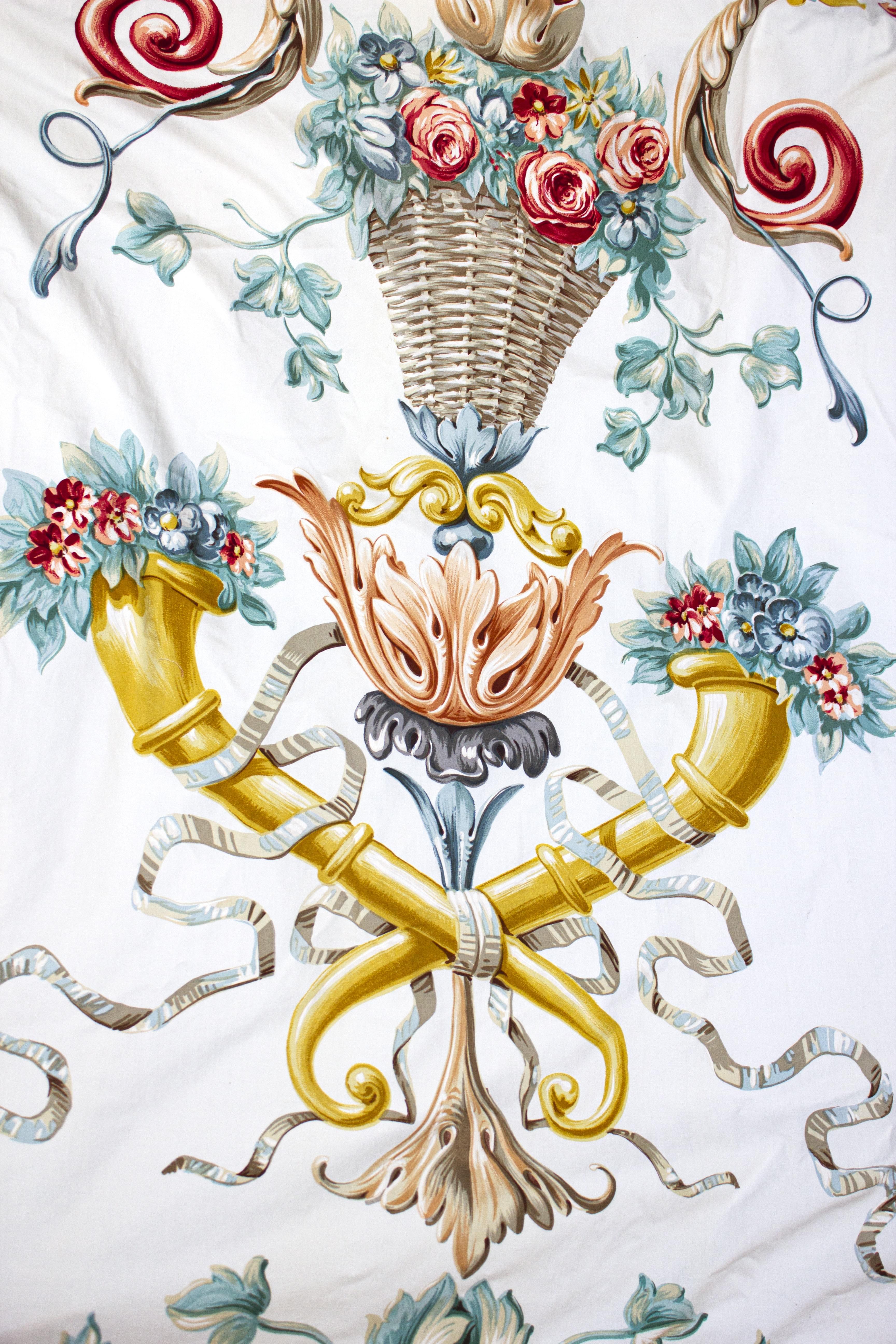 A motif de paniers fleuris sur fond blanc, H env 248 cm