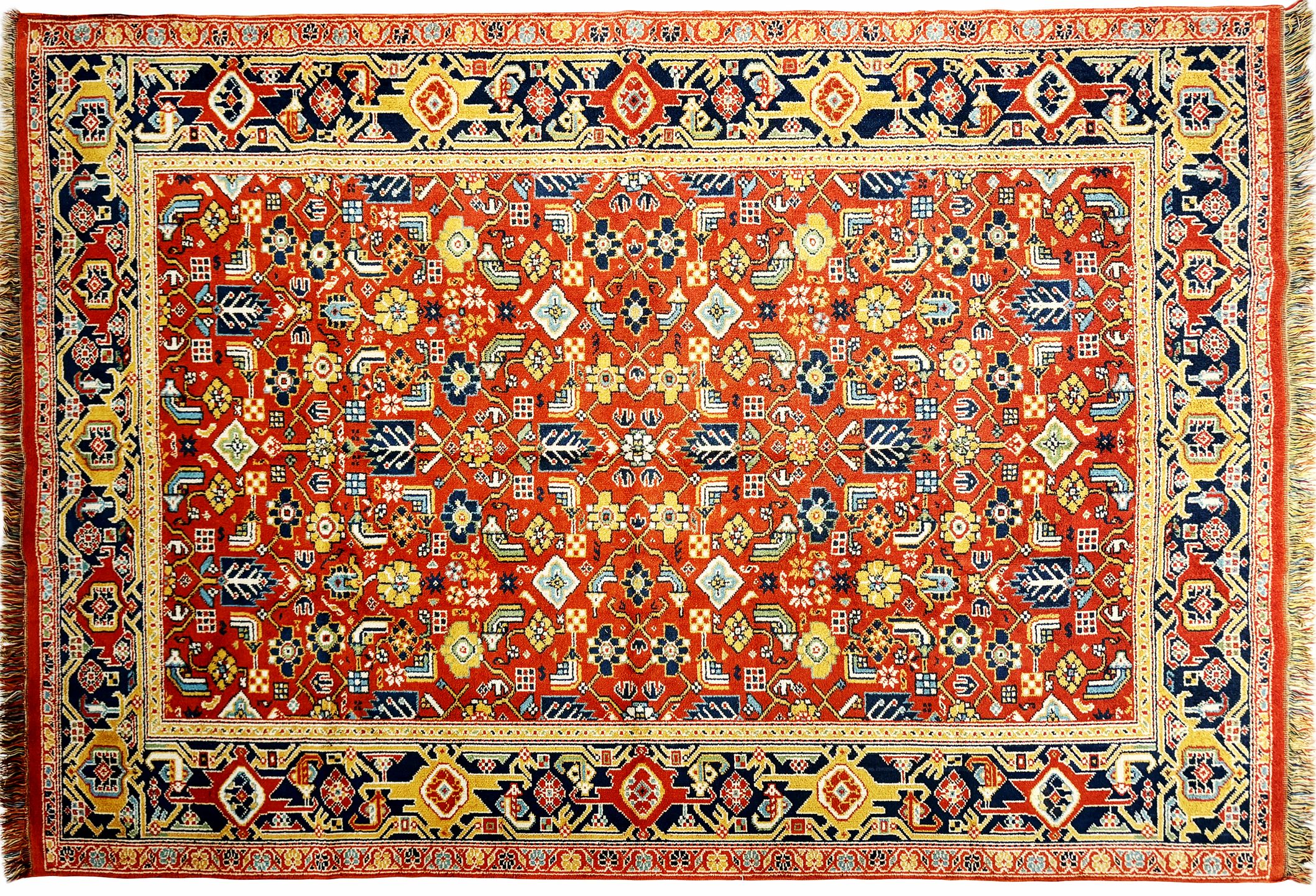 Laine à motif géométriques et floraux sur fond rouge brique, 282x193 cm. Provenance: Les Stern, une famille de collectionneurs. Pour les lots précédés d’un *, la TVA de 8,1% est due sur l’entier du prix d’adjudication.