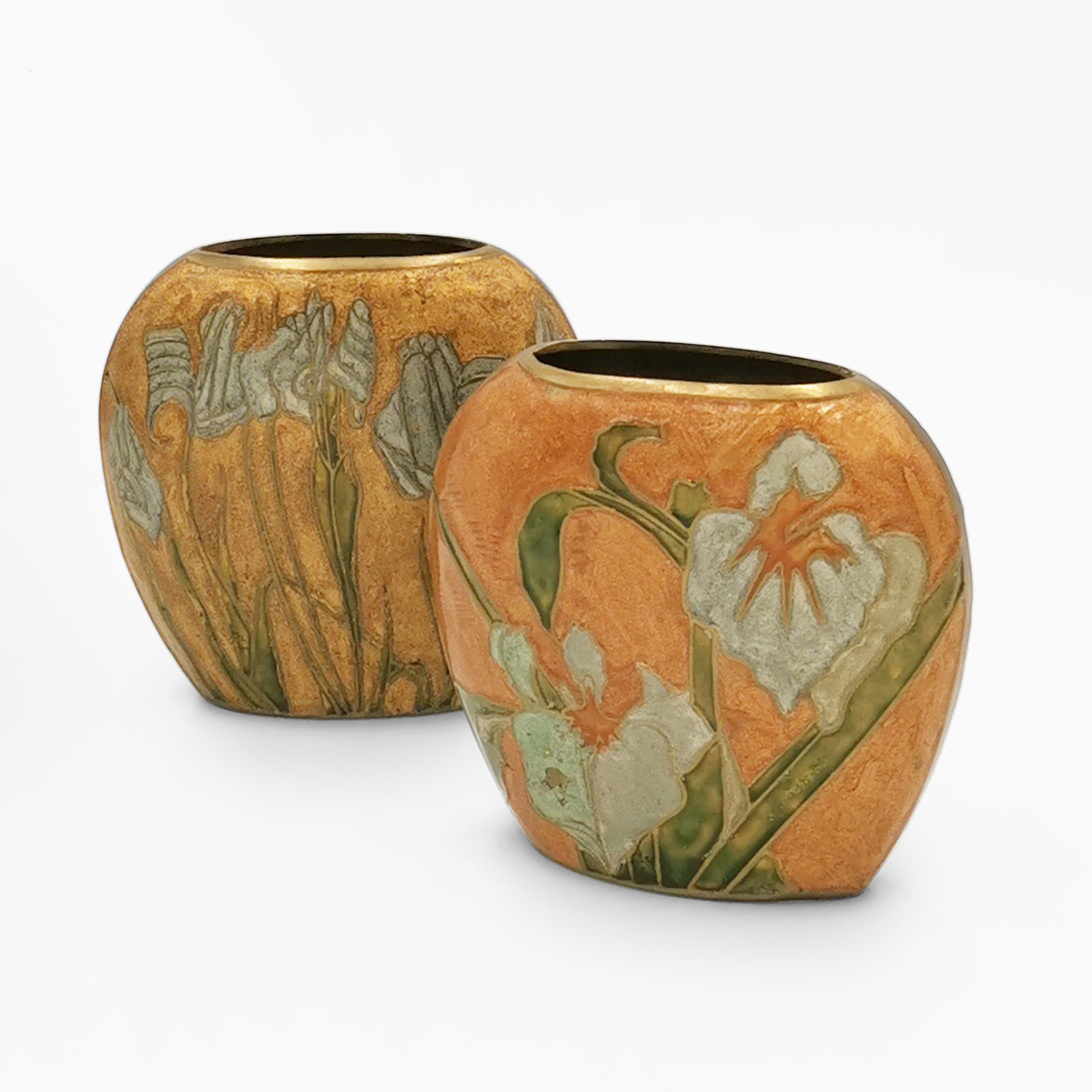 1. Paire de flambeaux à décor repoussé de larges fleurs et acanthes