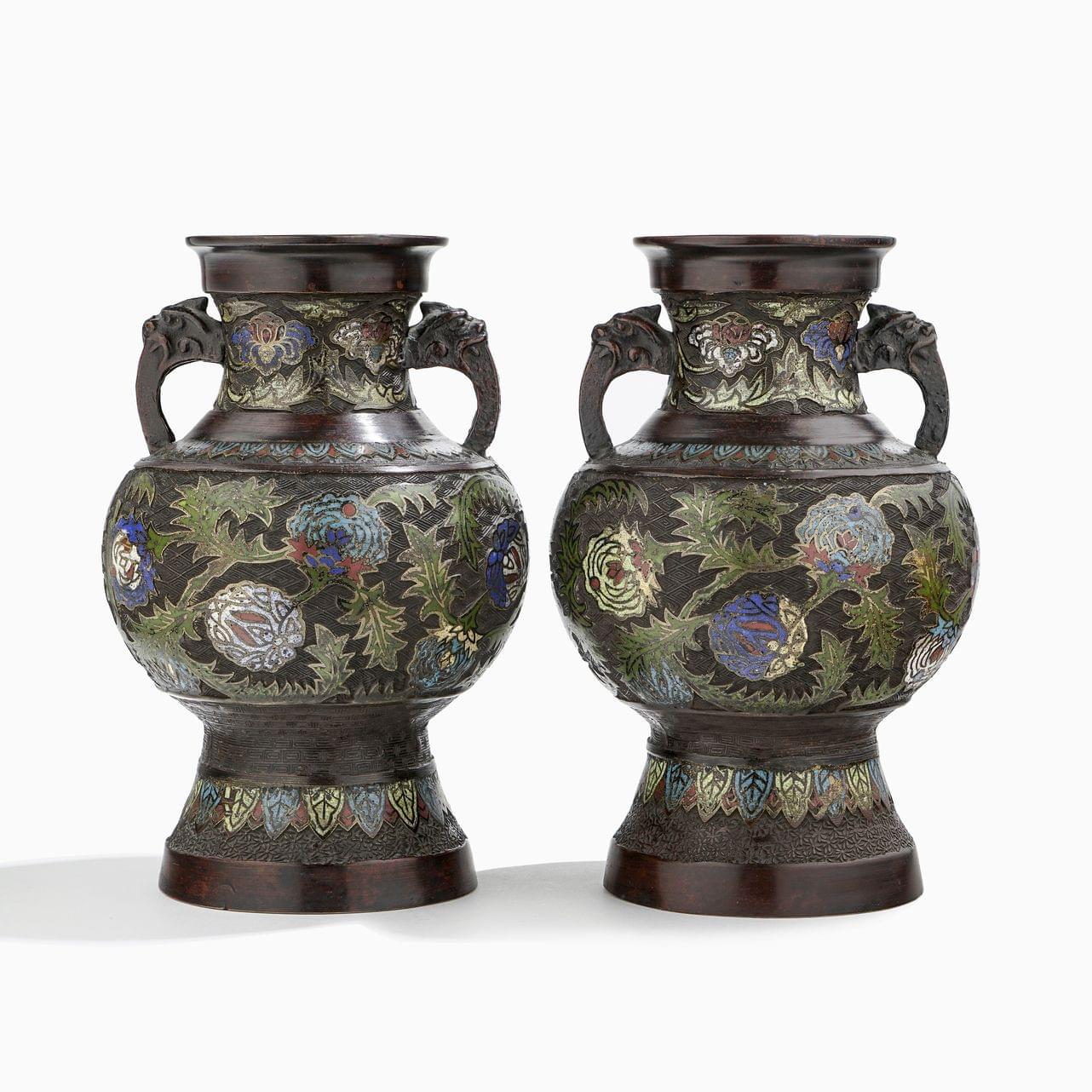 Bronze patiné à décor d'émaux cloisonnés à motifs floraux, marque apocryphe Qianlong, H 30 cm