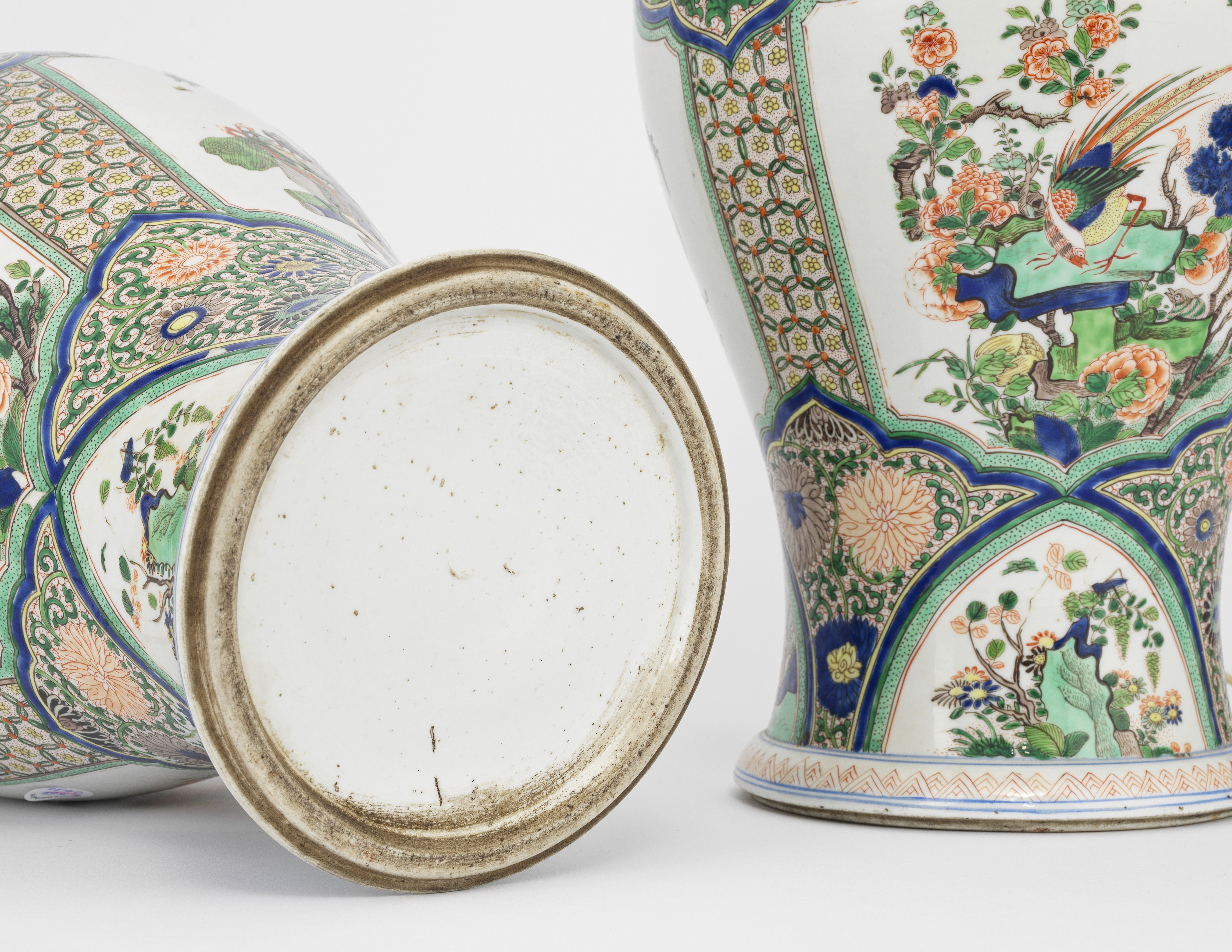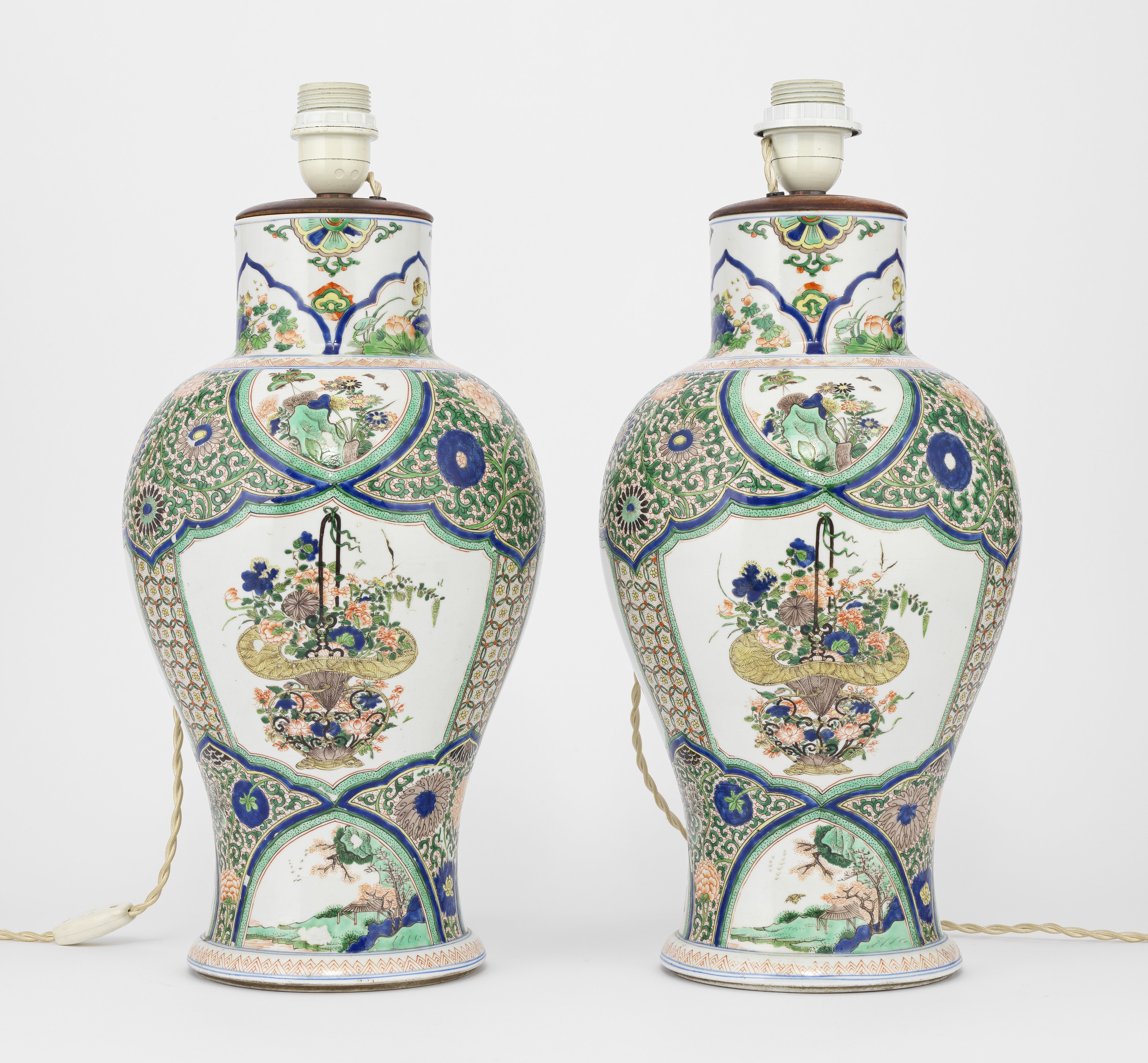 5255. Paire de vases balustres montés en lampe, famille verte, dynastie Qing (1644-1912)