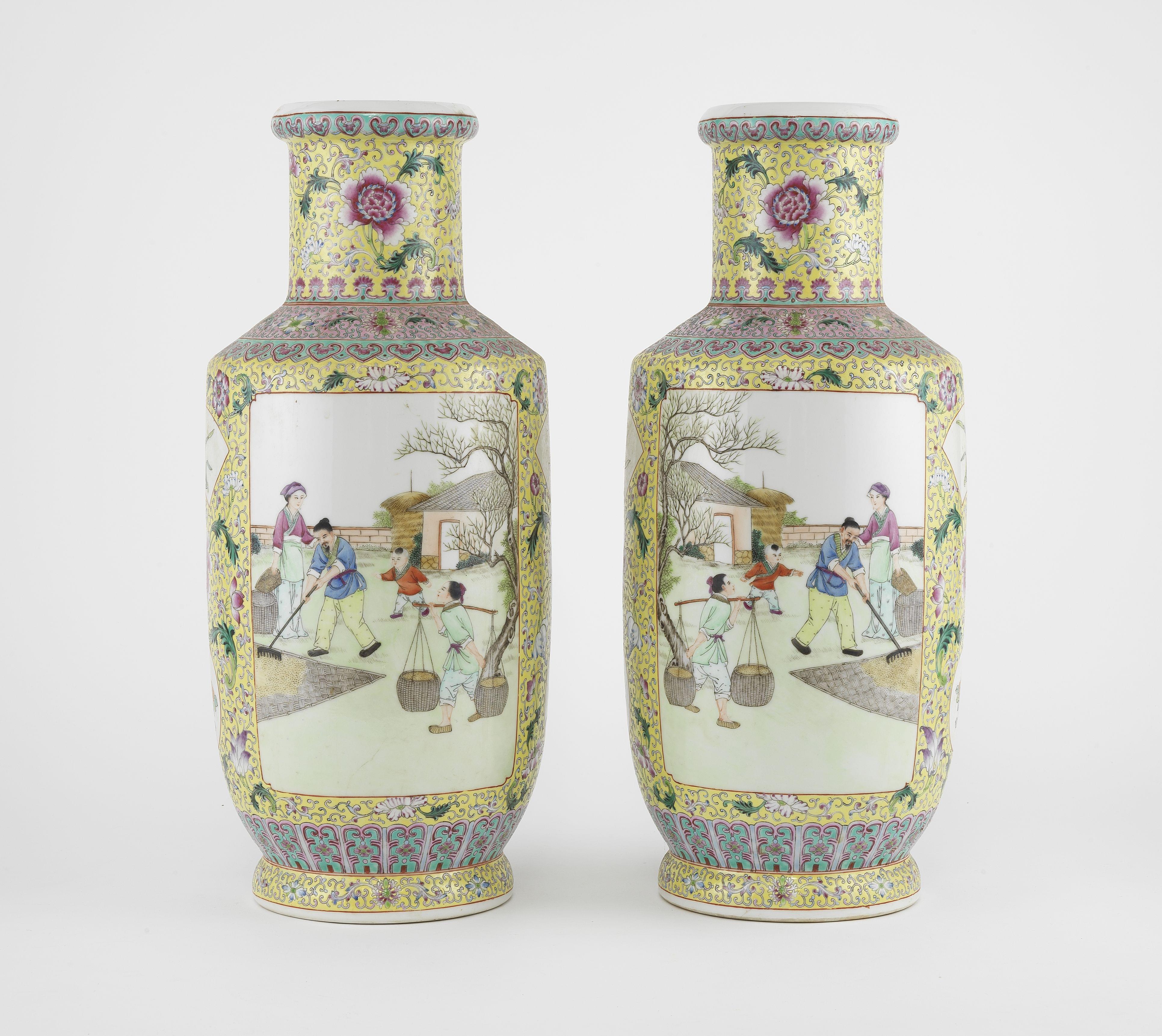 Porcelaine émaillée polychrome à motifs de scènes animées, H 46 cm