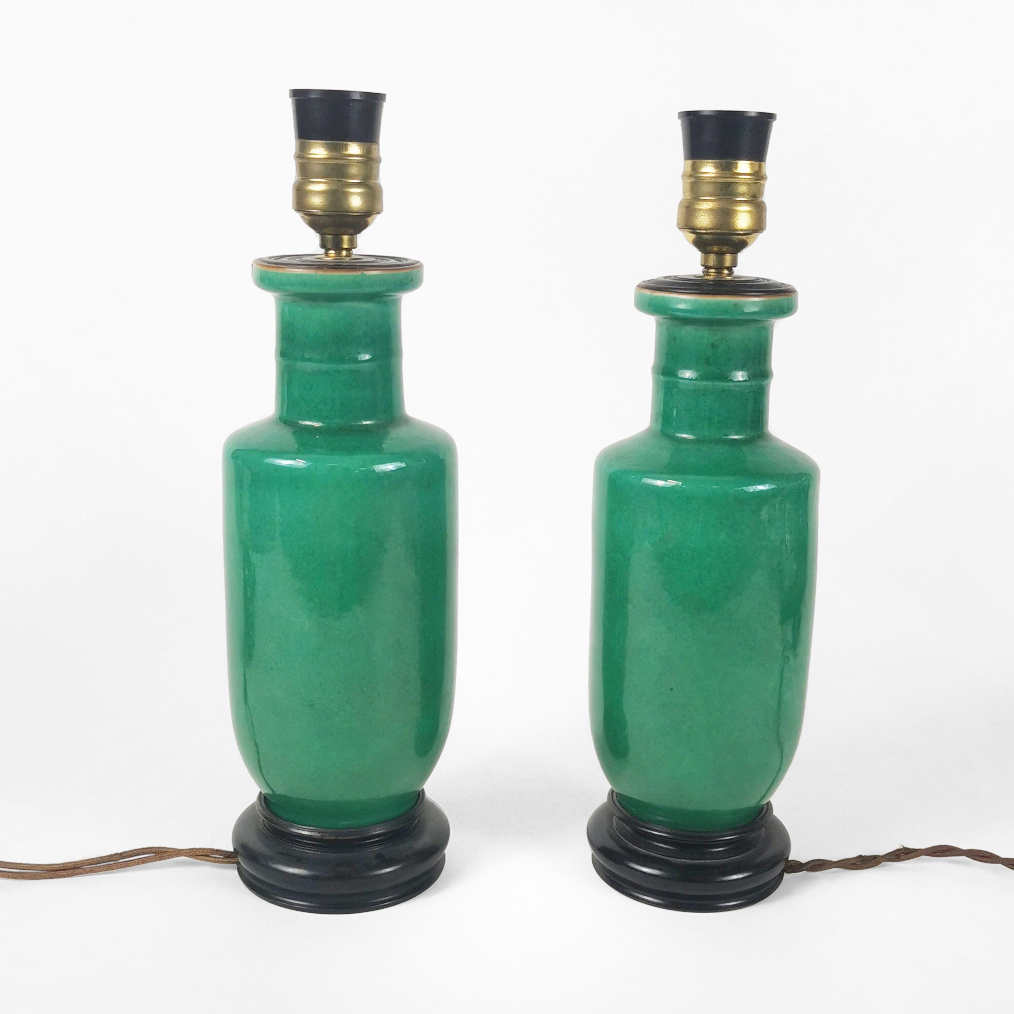 Porcelaine émaillée monochrome vert, percés à l'électricité, H 23 cm
