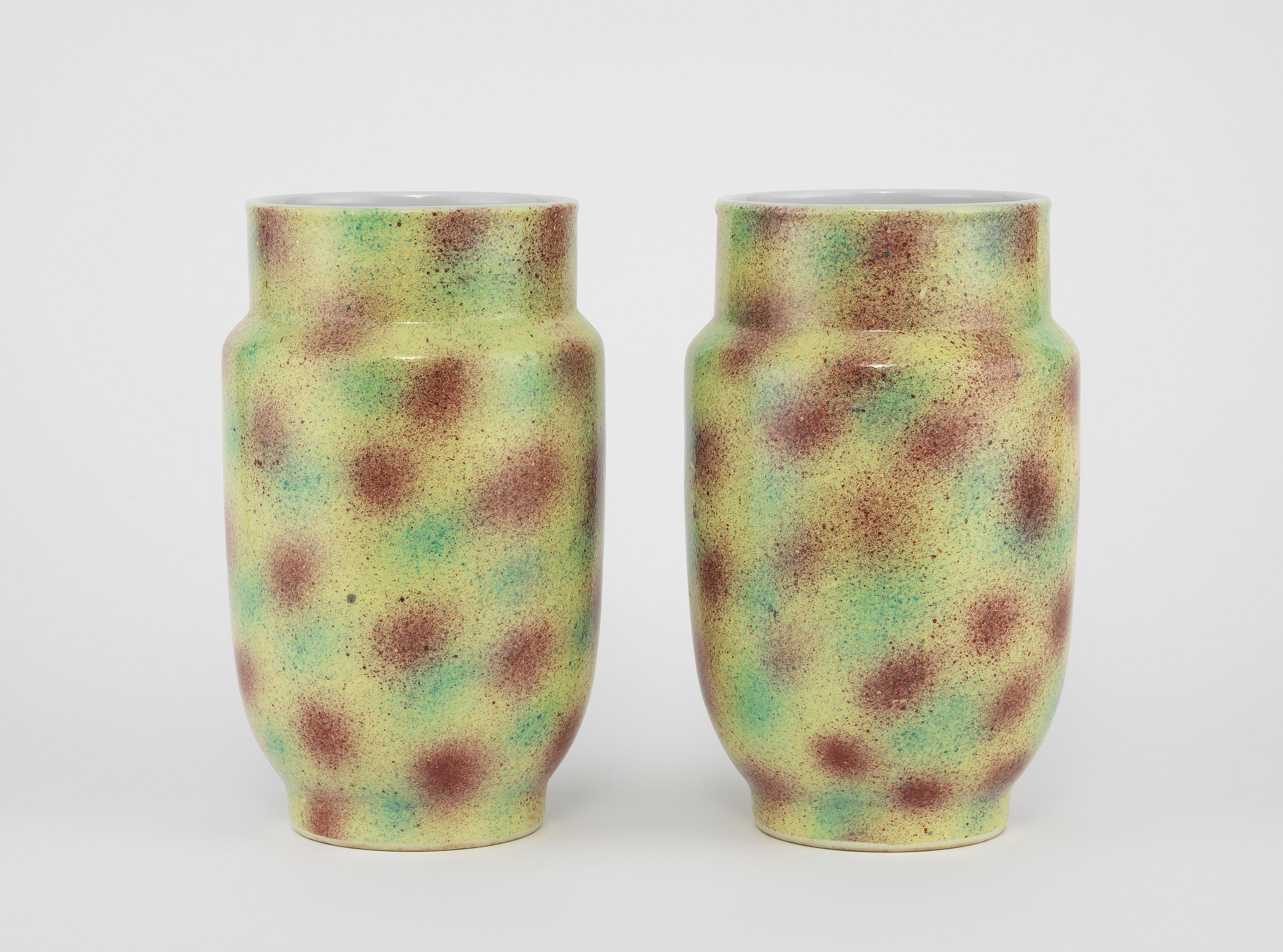 Porcelaine émaillée à motifs soufflés rouges, jaunes et verts, H 23 cm