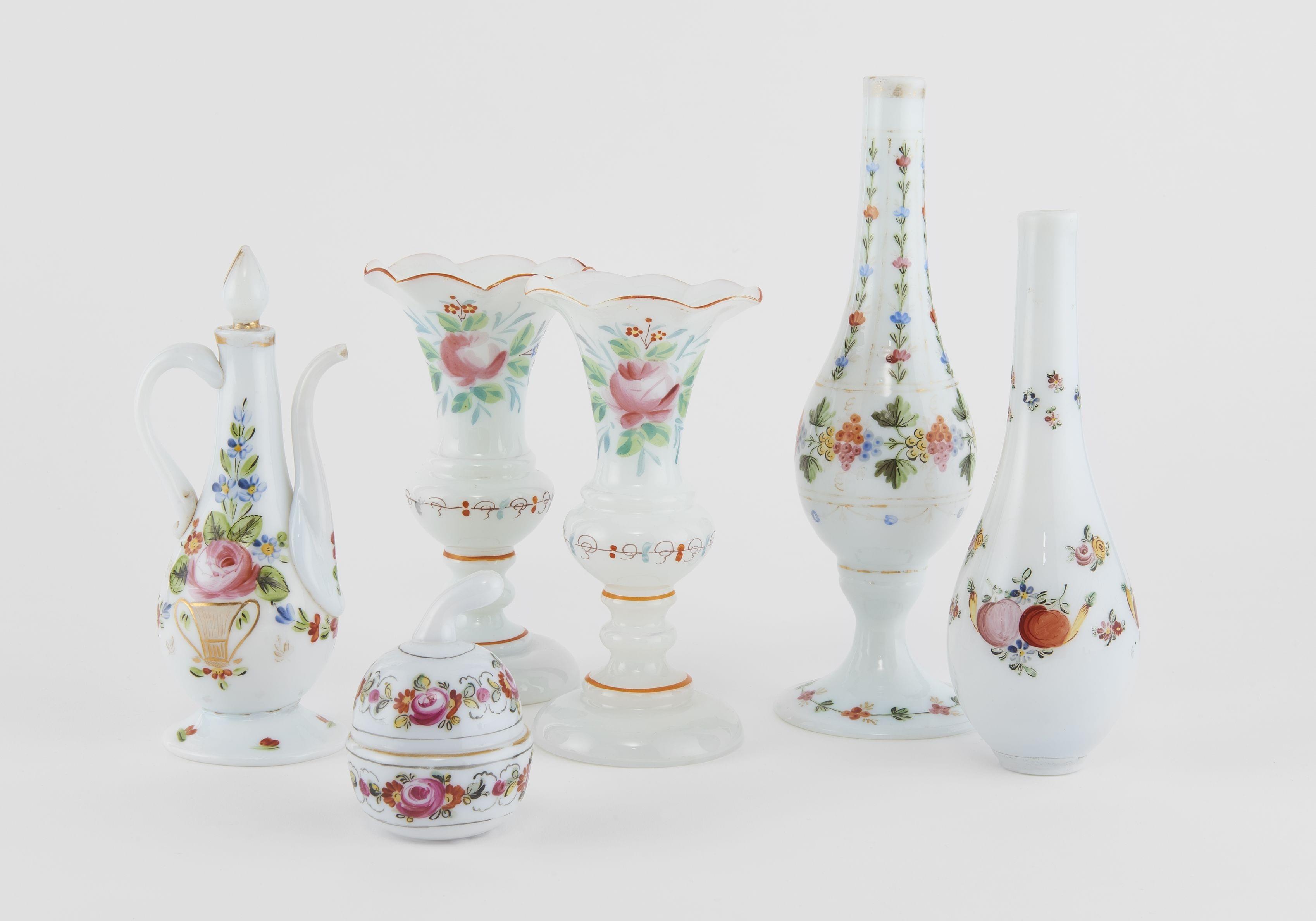 Opaline à décor polychrome et or de fleurs, H de 9 à 24 cm