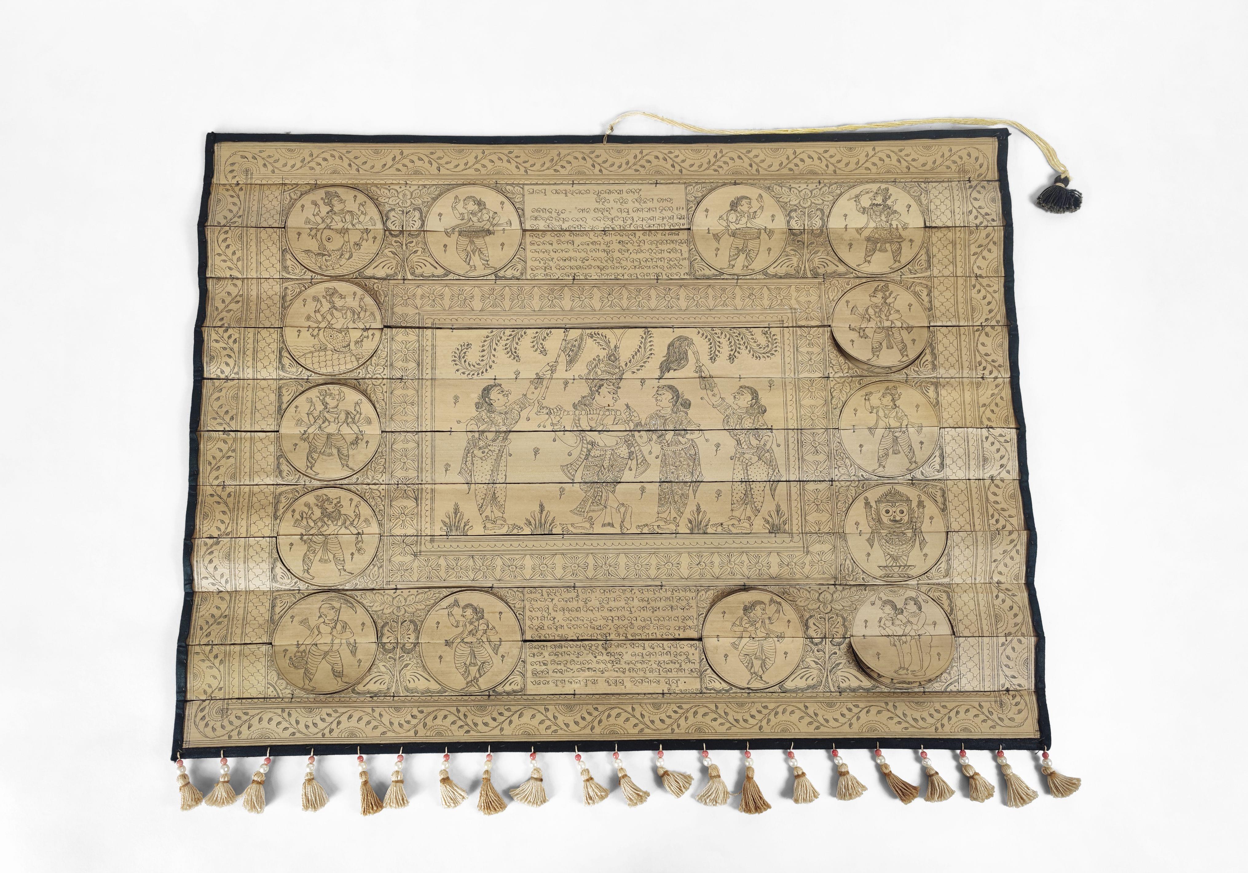 Lattes de bois gravés à décor de divinités, 38x50 cm