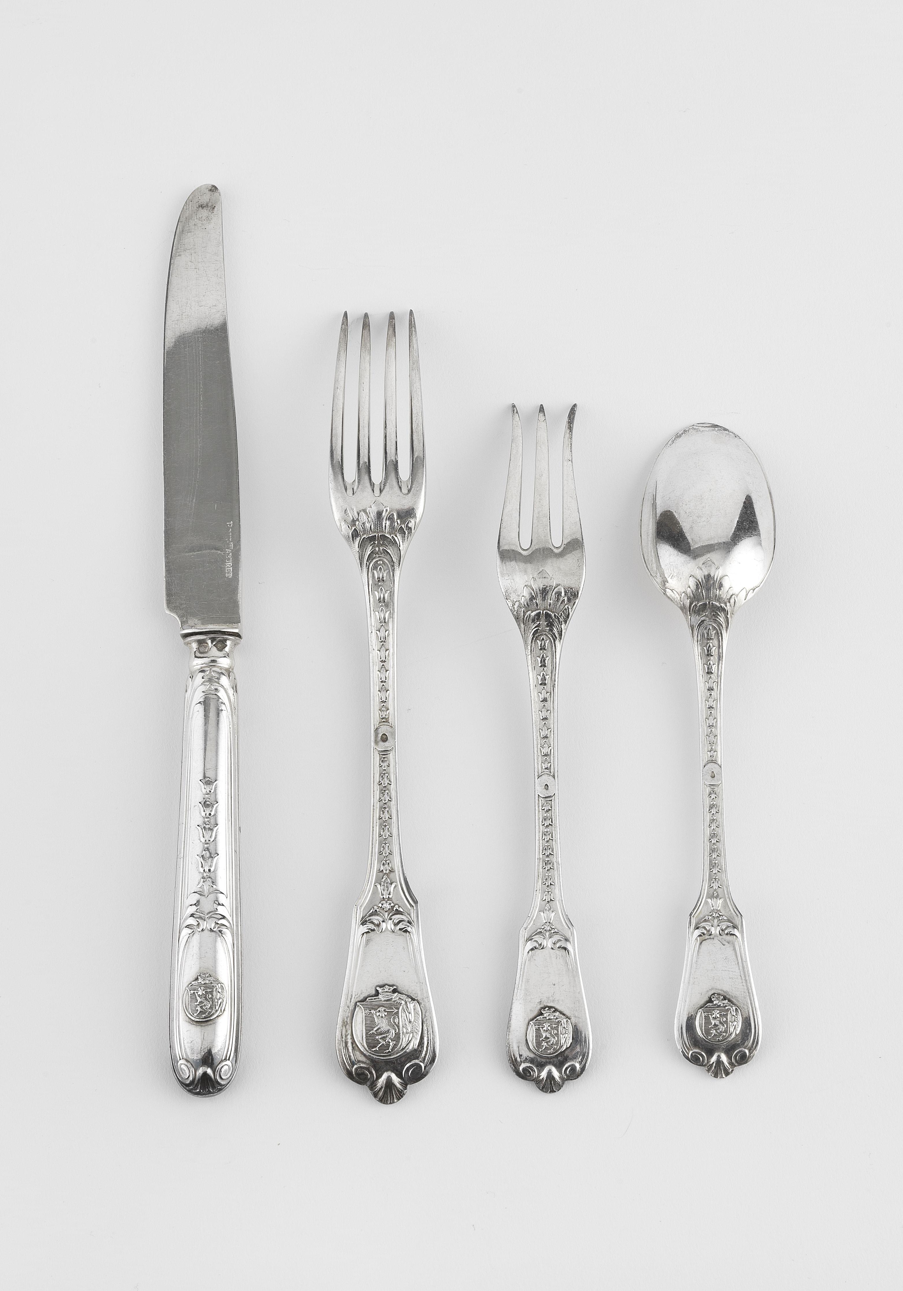 France, argent, comprenant: 12 fourchettes, 12 couteaux et 12 cuillères à entremets, 12 fourchettes à pâtisserie, 12 couteaux à fromage, 6 cuillères à glace, 4 pièces de service, 1850 g (70p). Provenance Habsbourg: succession de l'archiduc Albert II d'Autrich-Teschen