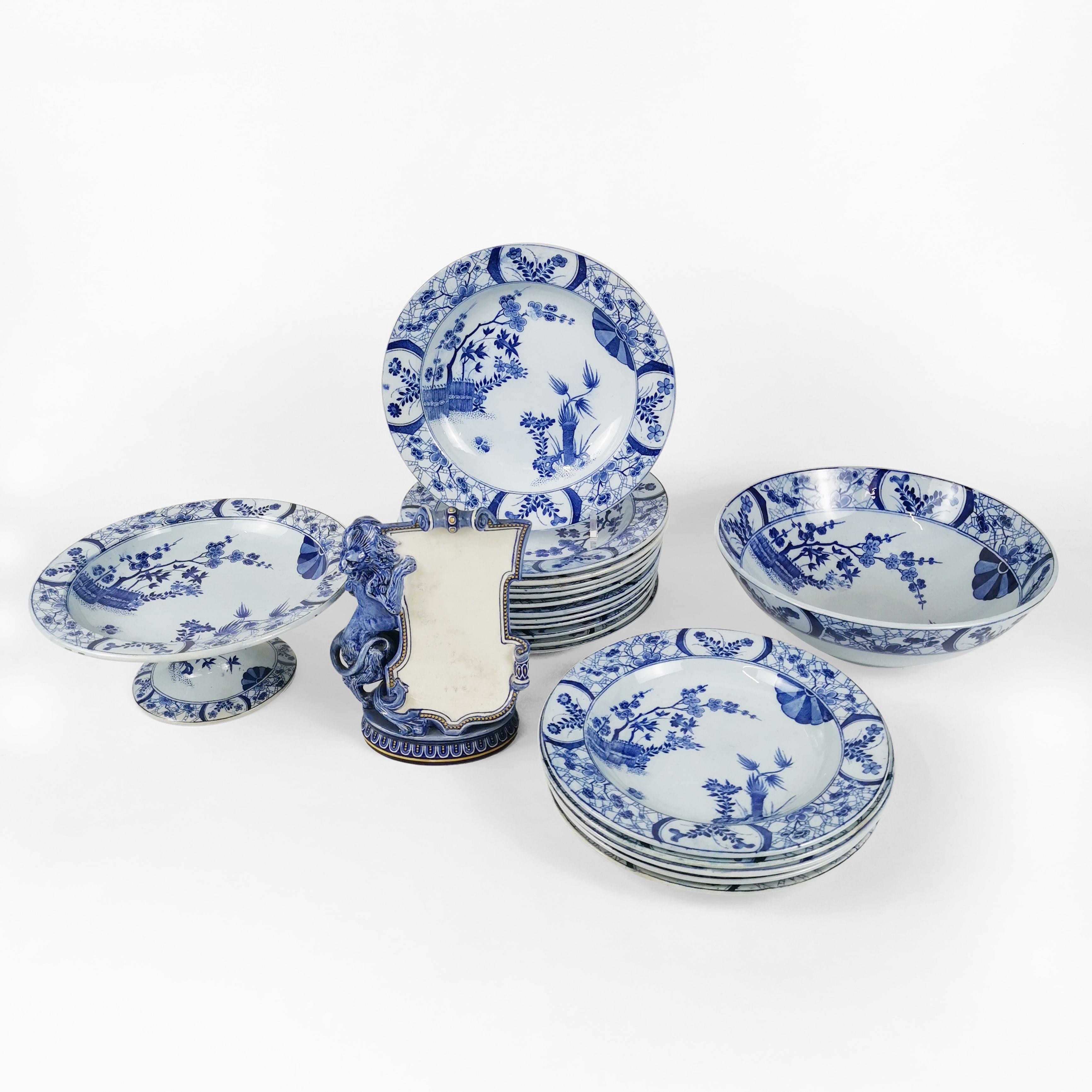 Creil-Montereau, faïence, comprenant: 18 assiettes, 12 creuses, 3 plats creux, 1 compotier. On joint un porte menu figurant un lion tenant un blason, modèle Cluny, Sarrguemines, faïence, H 19 cm (35p)