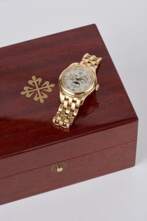 Cadran crème, chiffres romains et aiguilles dorés et luminescents, phases de la Lune, date, jour et mois, réserve de marche, fonds transparent, réf. 5036/1R, or rose 750, D 37 mm, poids brut 153 g, avec certificat d'origine
