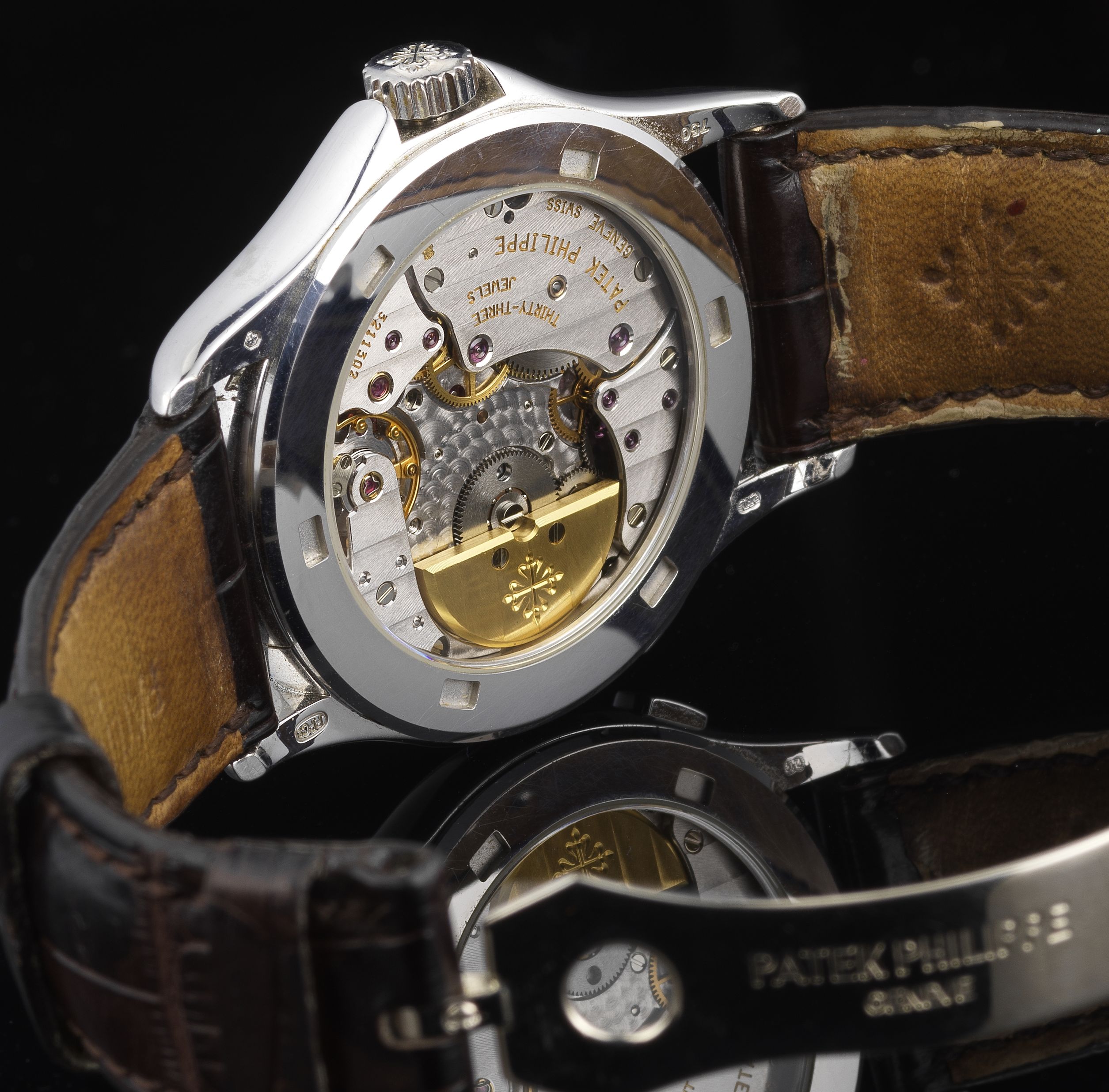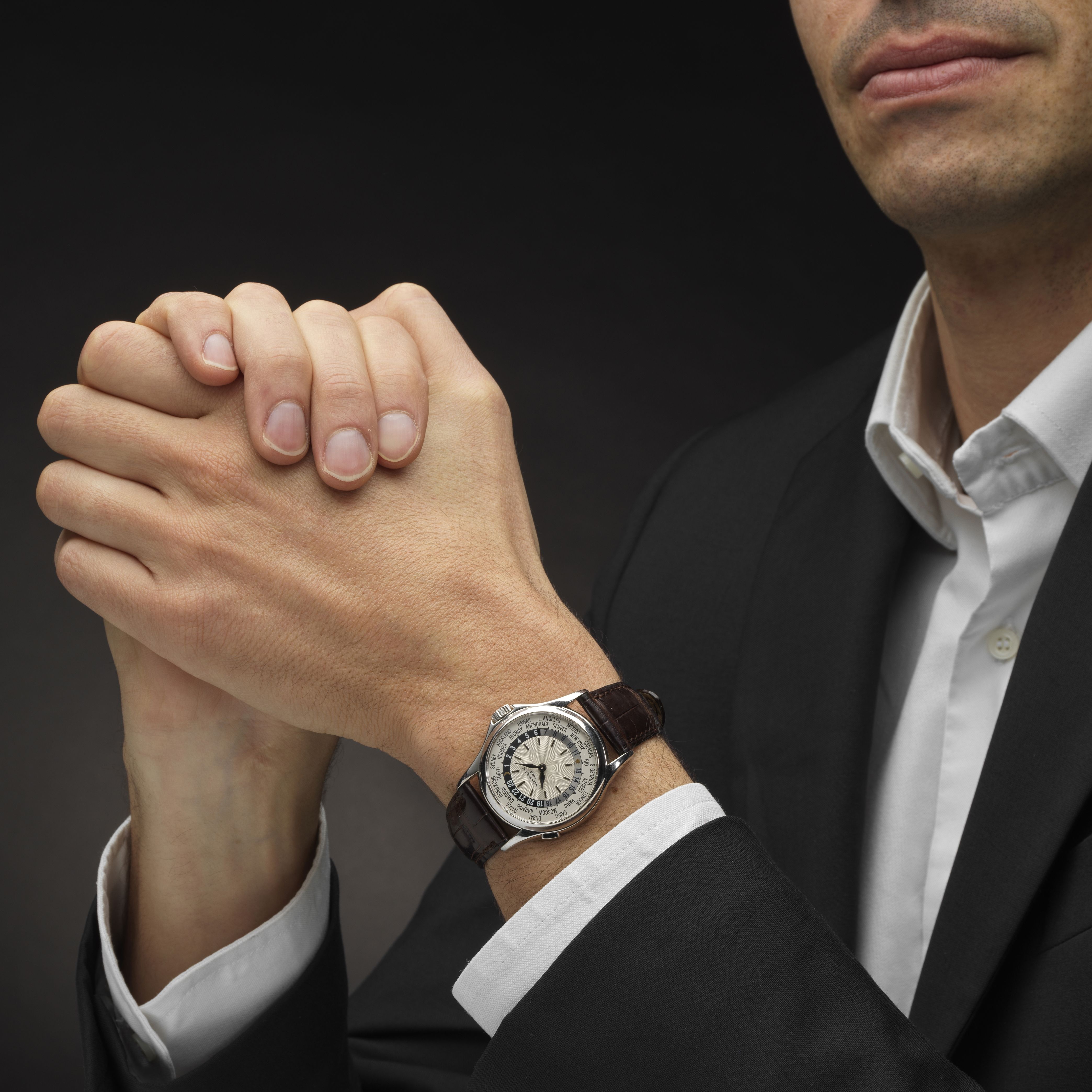 Cadran argenté guilloché, aiguilles argentées, fonction Heure Universelle pour connaître l'heure dans 24 fuseaux horaires différents au même moment, boucle déployante Patek Philippe, or gris 750, D 35 mm, poids brut 84 g