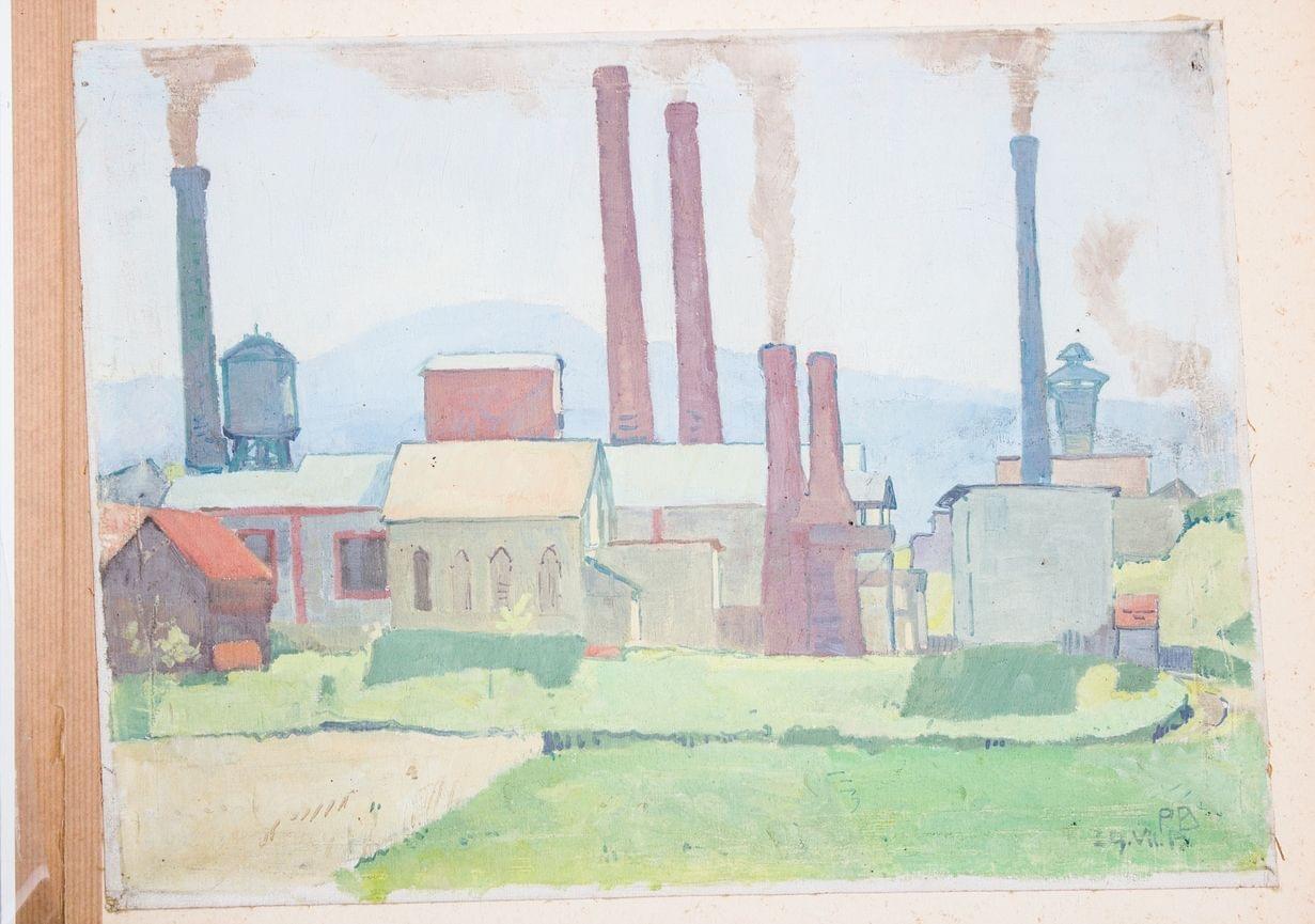 Usine, huile sur toile, signé et daté 19, 31x40 cm