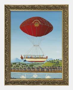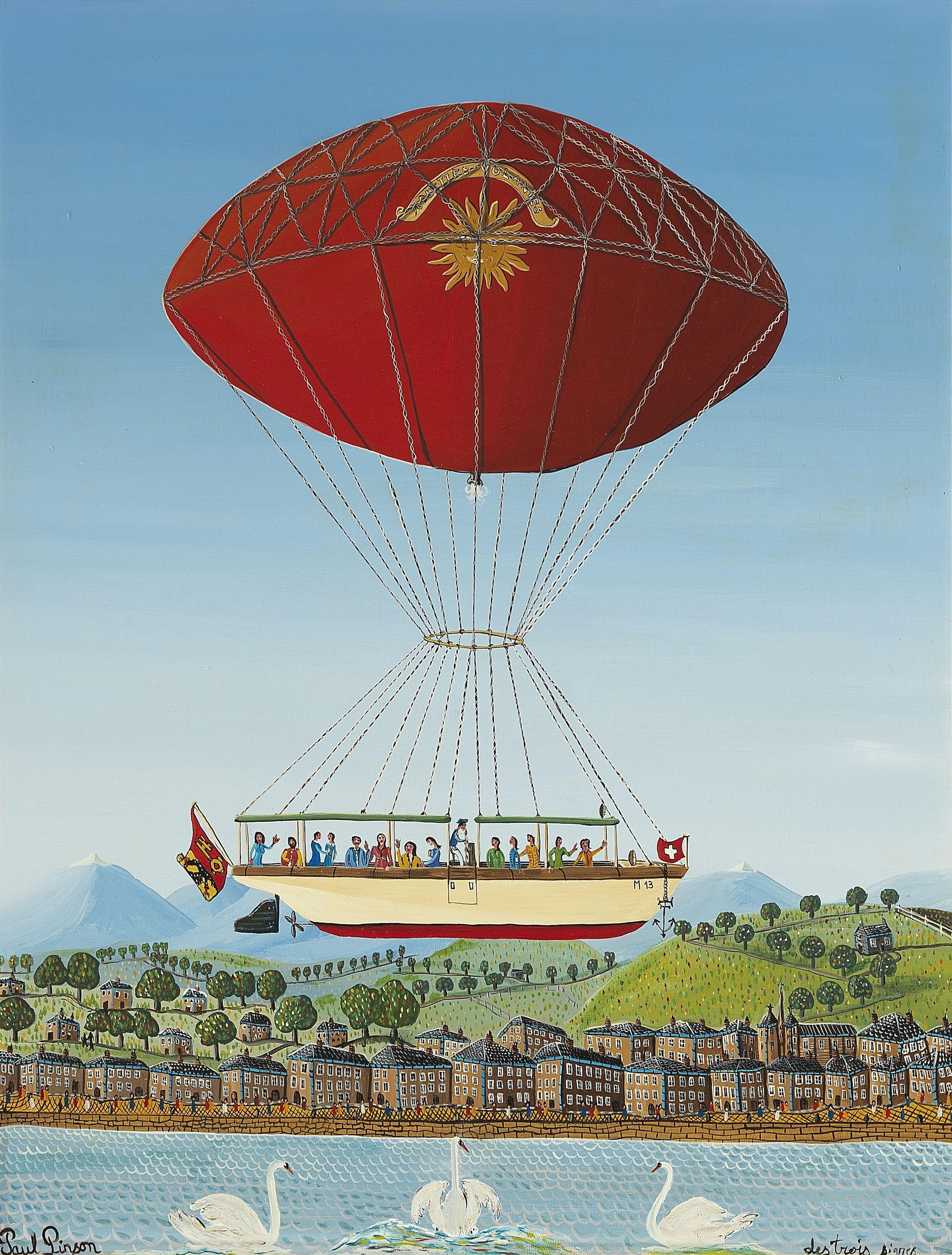 Montgolfière au-dessus de Genève, huile sur toile, signée, 85x50 cm