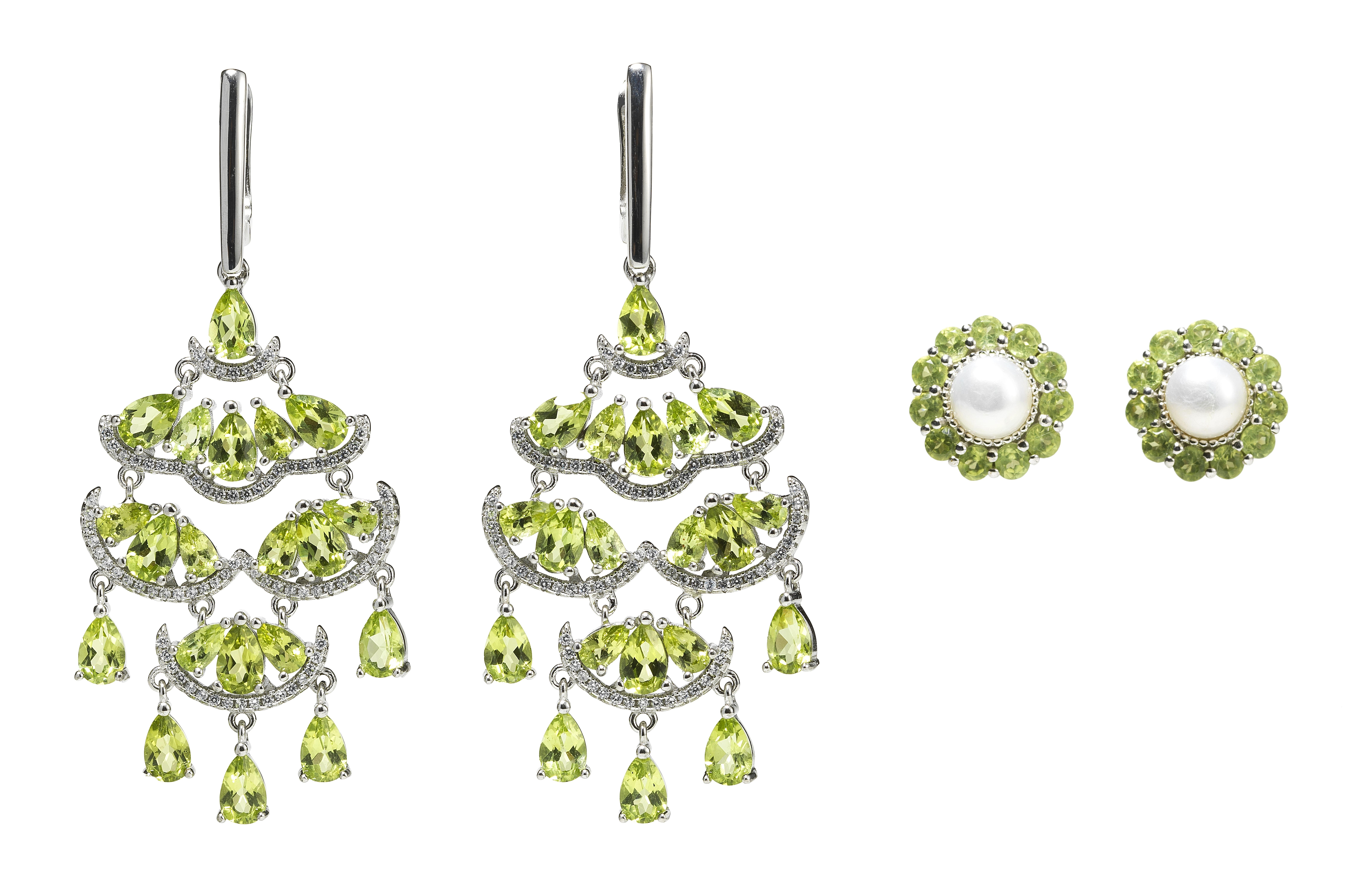 Pavées de péridots soulignés de pierres d'imitation pour le diamant, argent 925, H 6 cm. On joint des clous d'oreilles centrés de perles (D env. 7 mm) entourées de péridots taille brillant, argent 925. Pour les lots précédés d'un *, la TVA de 7,7% est due sur l'entier du prix d'adjudication.