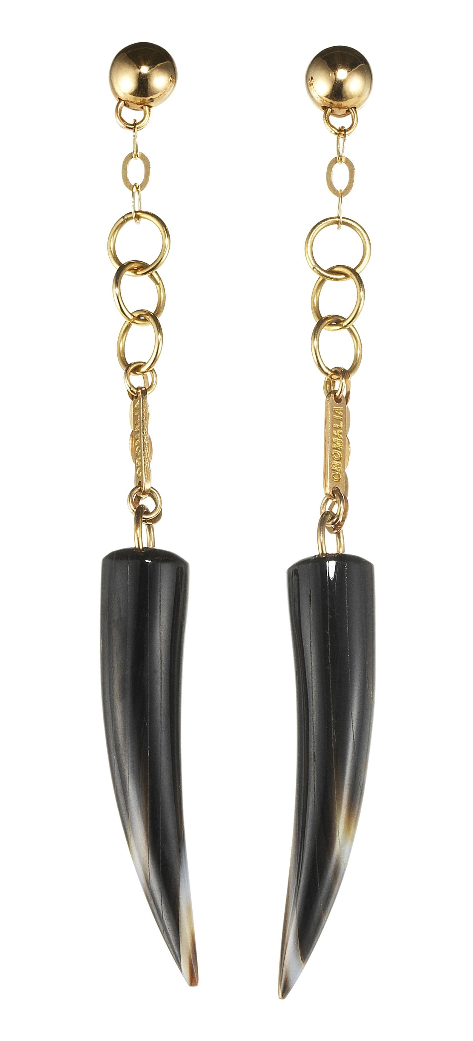 3128. Pendants d'oreilles longs retenant un motif de corne en nacre