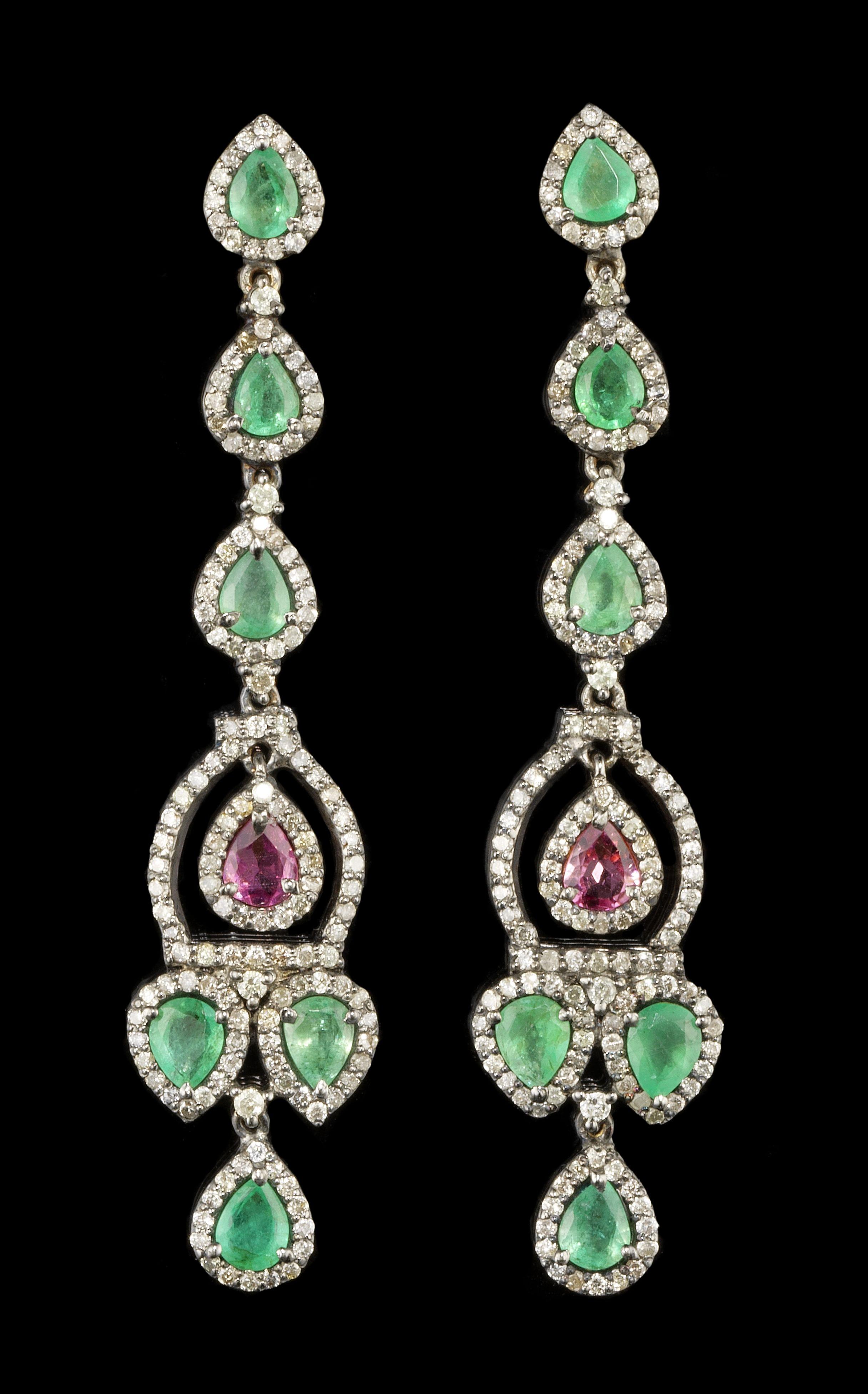 3312. *Pendants d'oreilles longs sertis d'émeraudes taille poire entourés de diamants et retenant une tourmaline rose taille poire