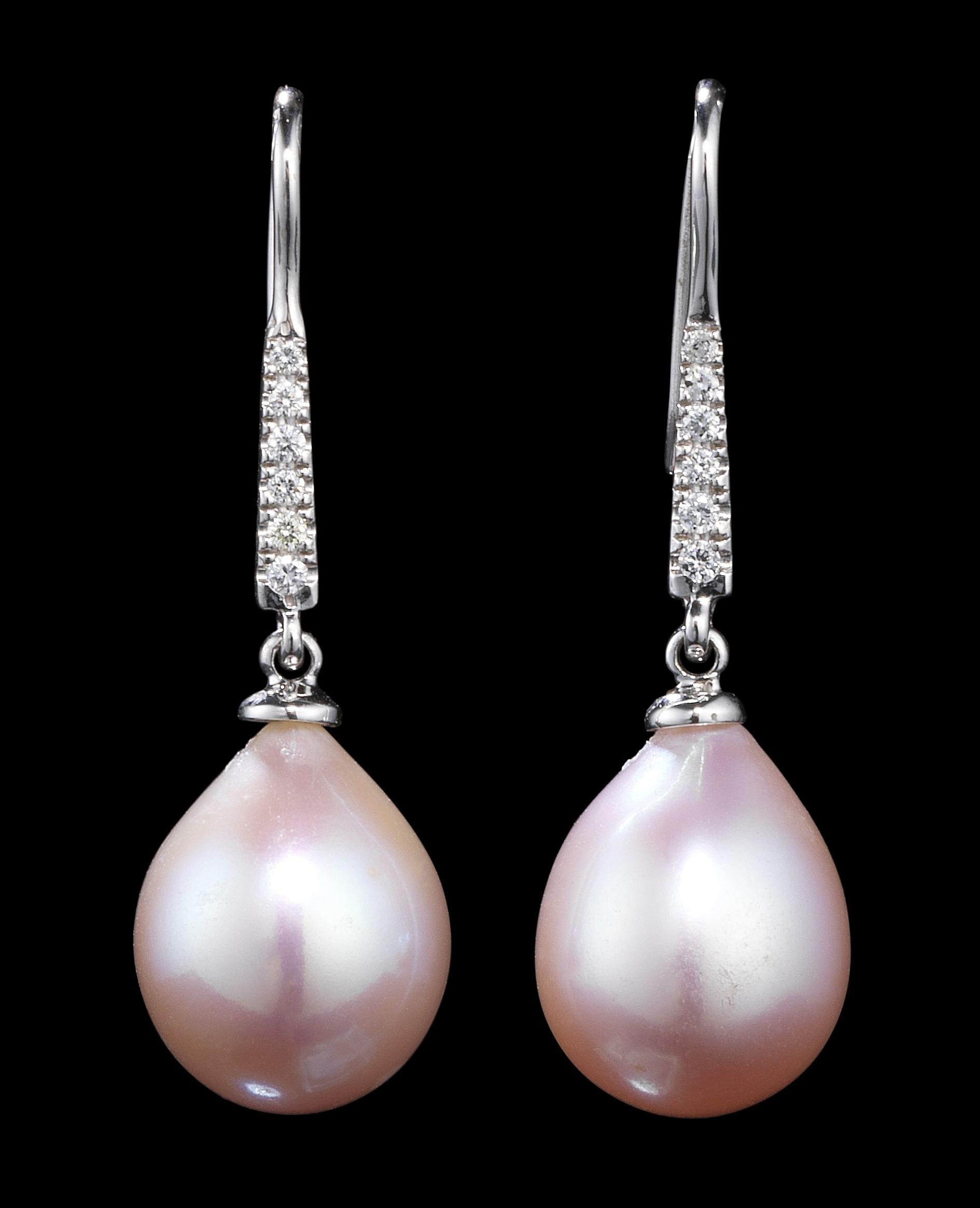 3269. Pendants d'oreilles retenant chacun une perle rosée en goutte rehaussée d'une ligne de diamants