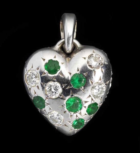 Une face pavée de diamants, l'autre sertie de diamants et d'émeraudes, or gris 750, H env. 2 cm, 5 g