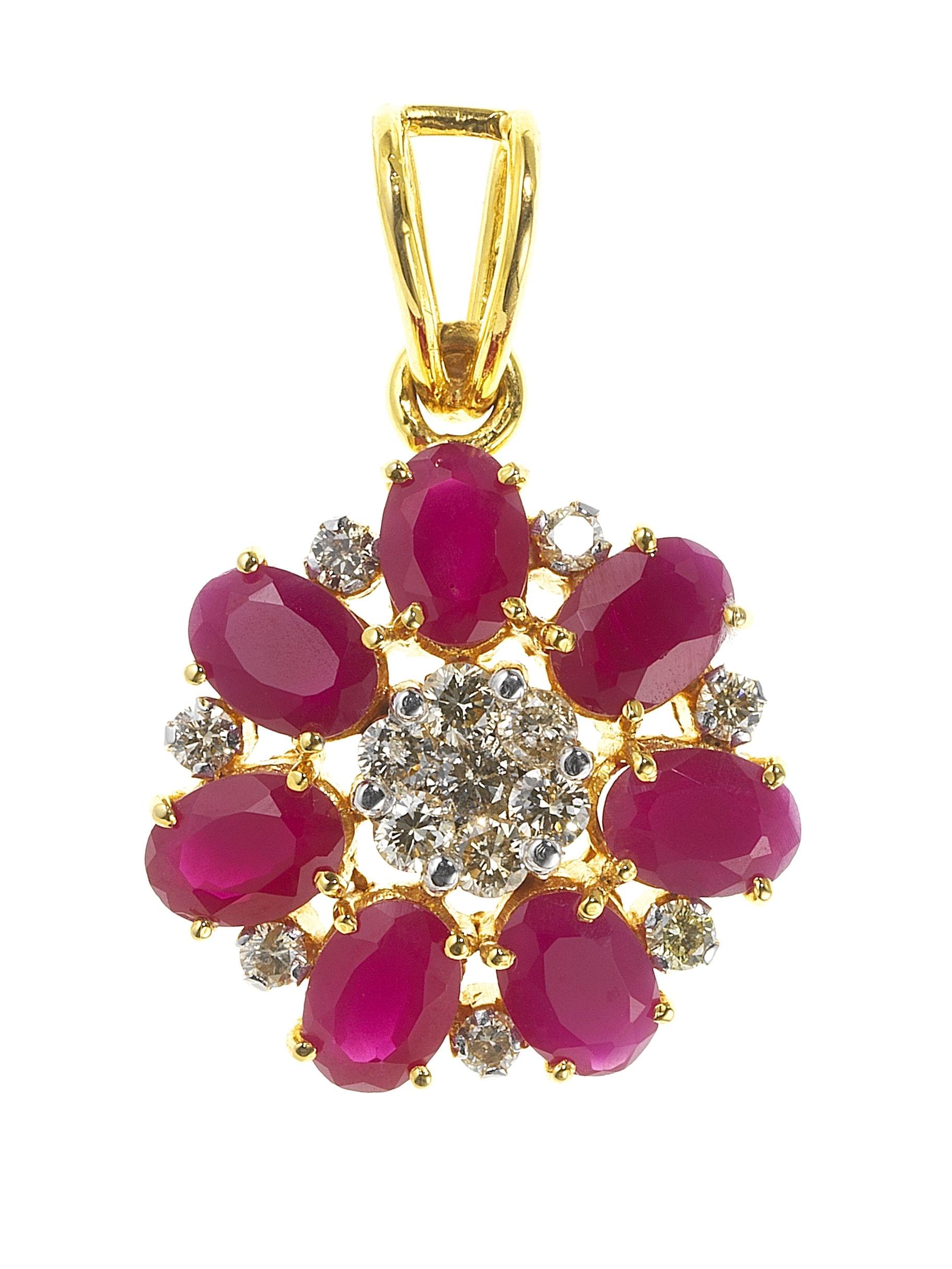 3187. *Pendentif à motif de fleur pavée en son centre de diamants (env. 0,9 ct) entourés de rubis taille ovale (env. 7 ct)