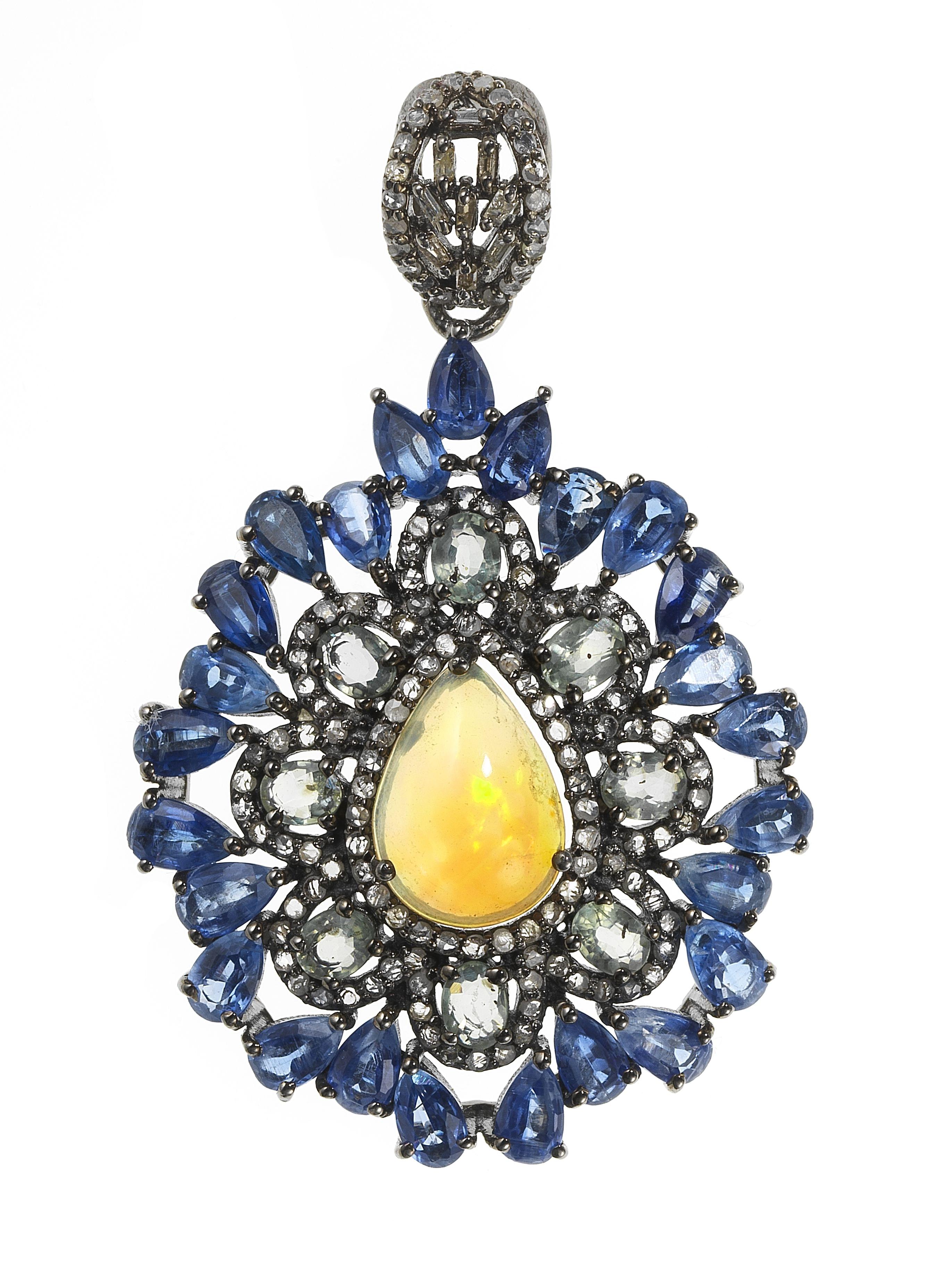 3131. *Pendentif centré d'une opale taille poire cabochon (env. 1,6 ct) entourée de saphirs verts taille ovale, de roses de diamant et de saphirs