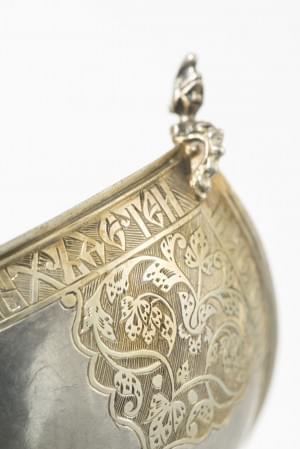 73. Petit kovsh sur pied ou Korchik de forme navette à décor de rinc...