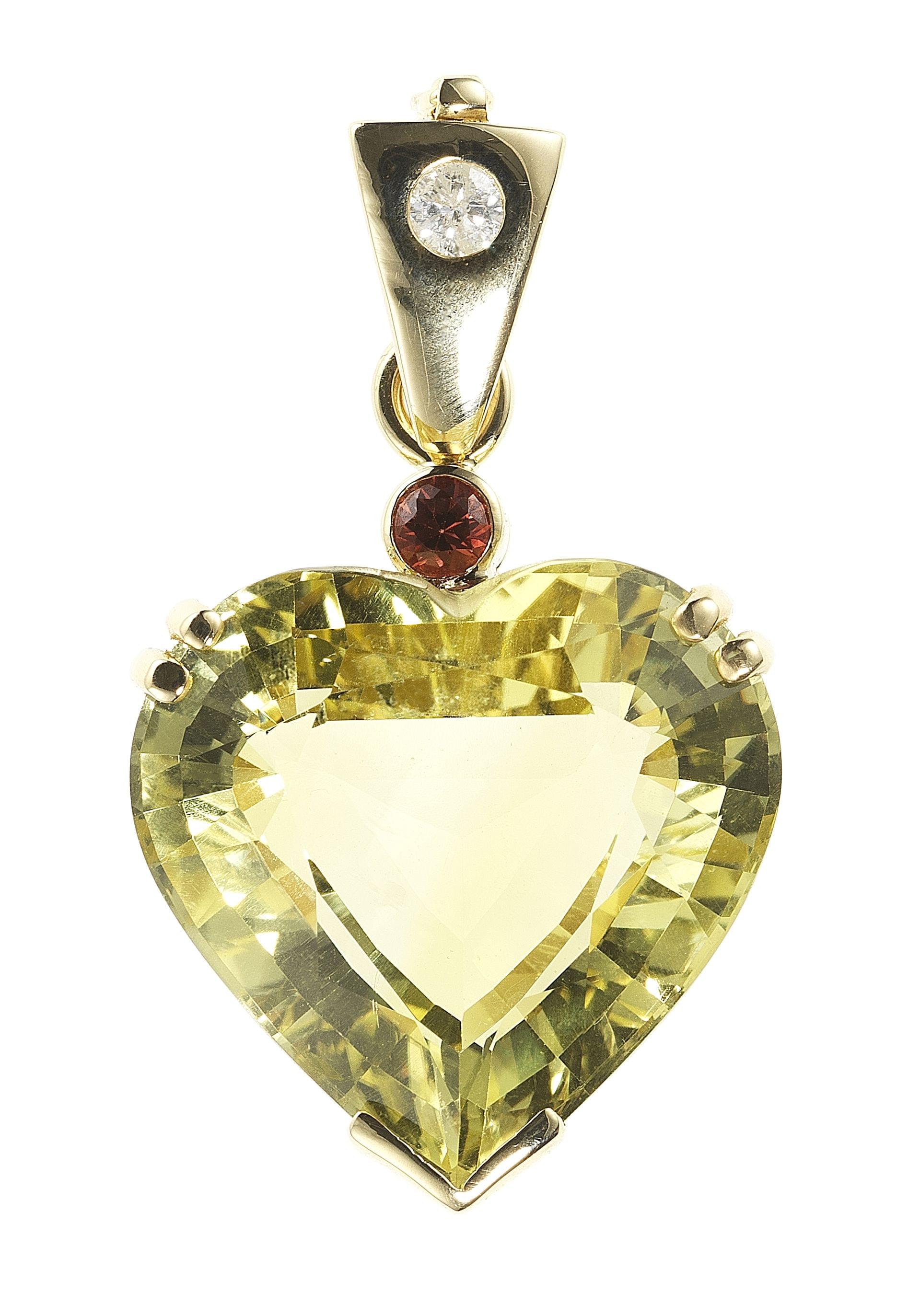 3321. Pendentif serti d'une citrine lemon taille cœur rehaussée d'un saphir orange et d'un petit diamant