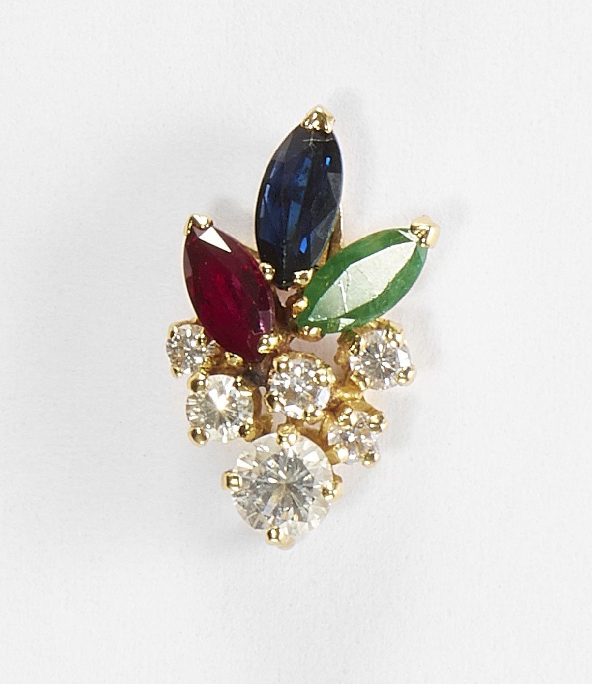 3122. Pendentif serti d'un saphir, d'un rubis et d'une émeraude taille marquise rehaussés de diamants