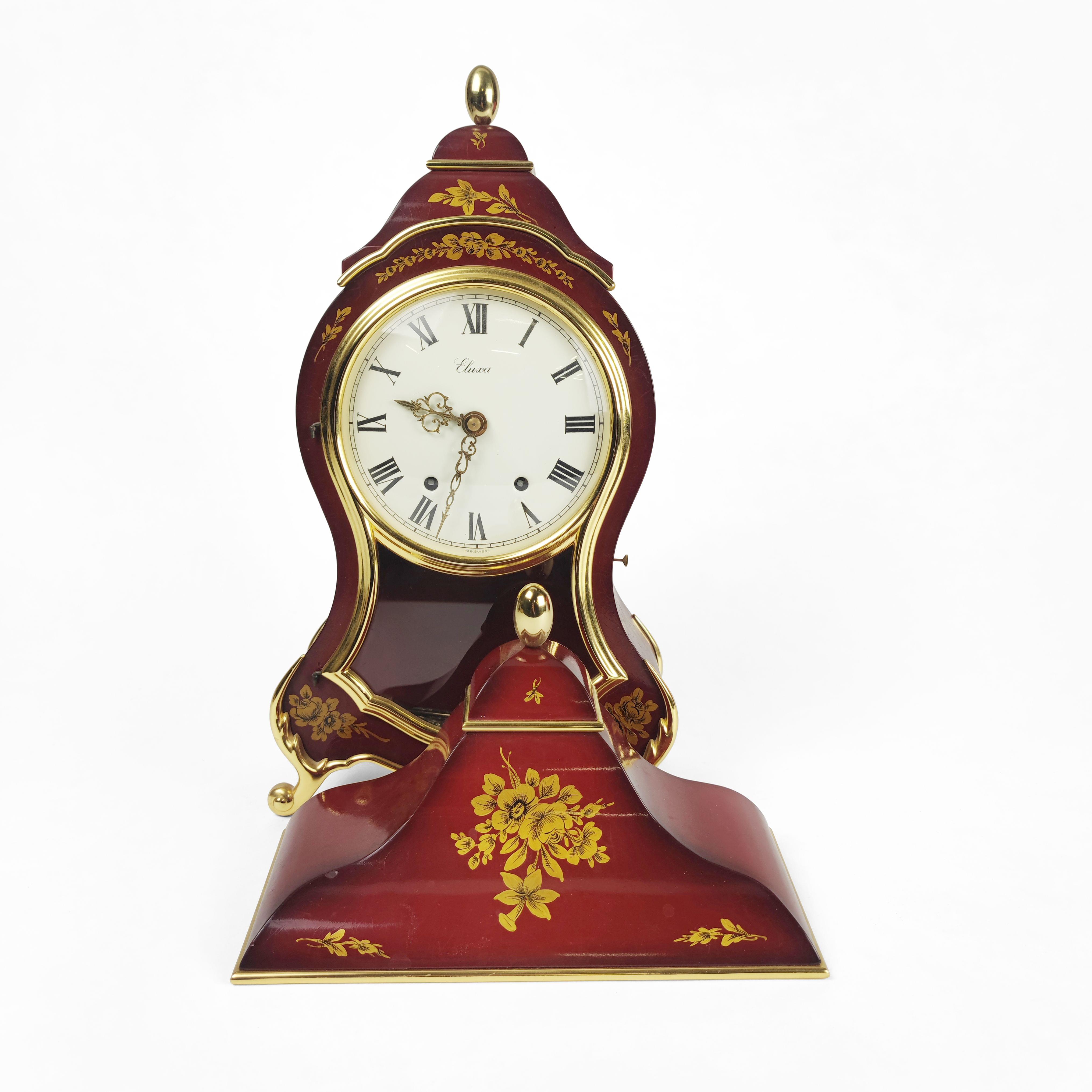 Bois laqué rouge, cadran émaillé blanc, H 54 cm