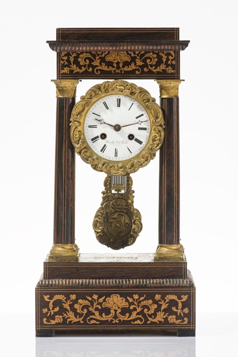 Palissandre, filets de bois clair, bronze doré, cadran émaillé blanc signé Bailly à Lyon, H 46 cm