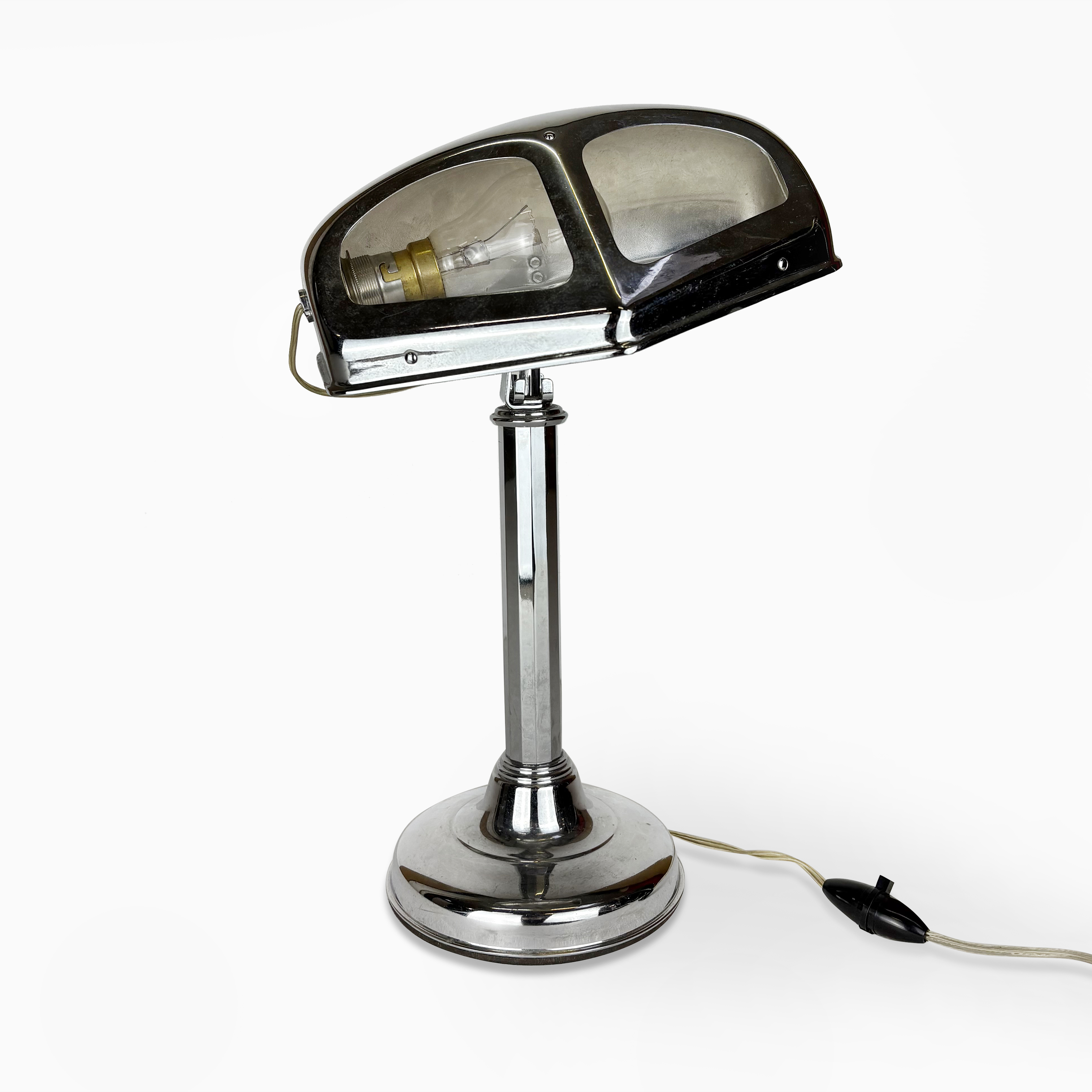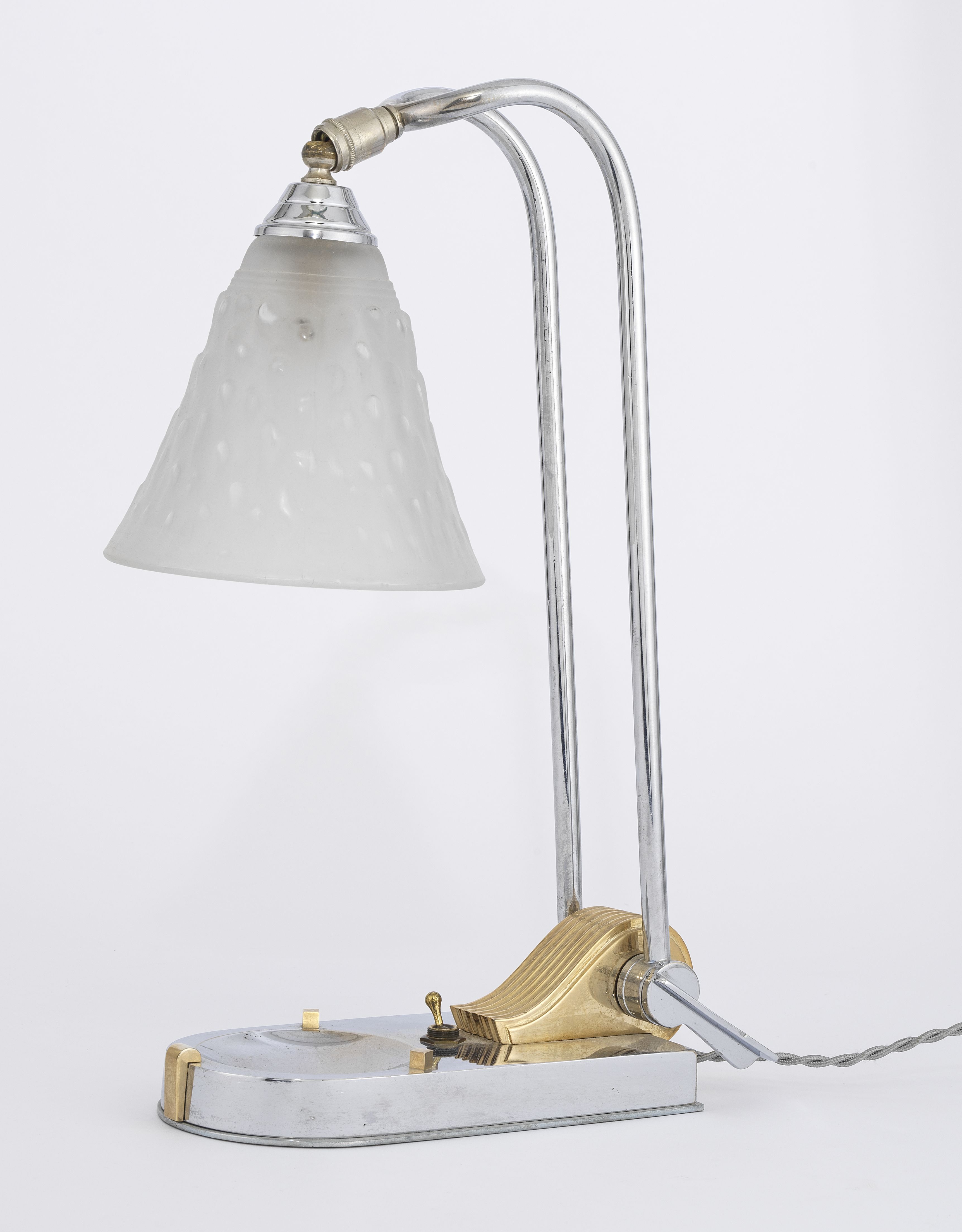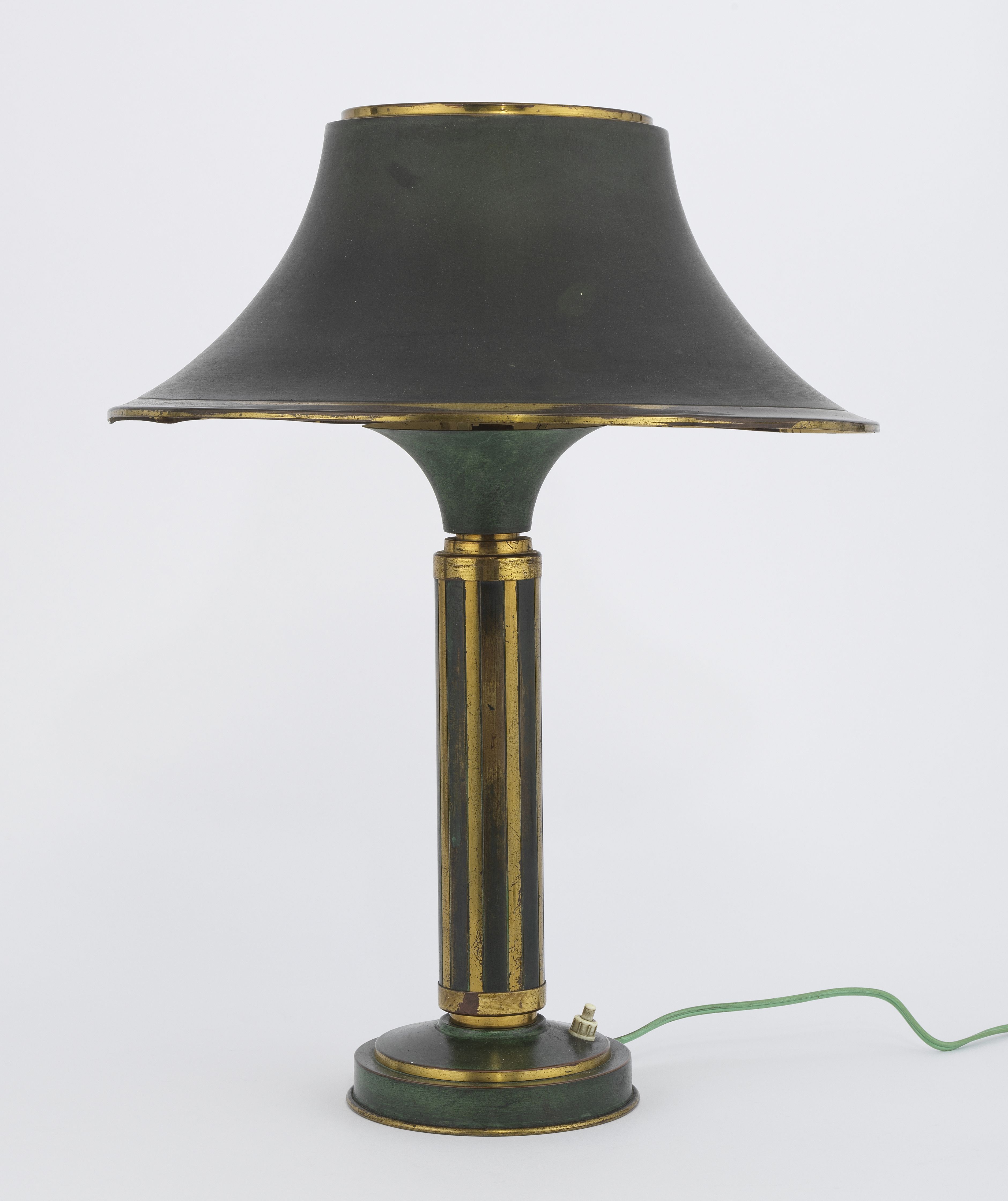 Laiton, tôle laquée vert et verre sablé, H 45 cm