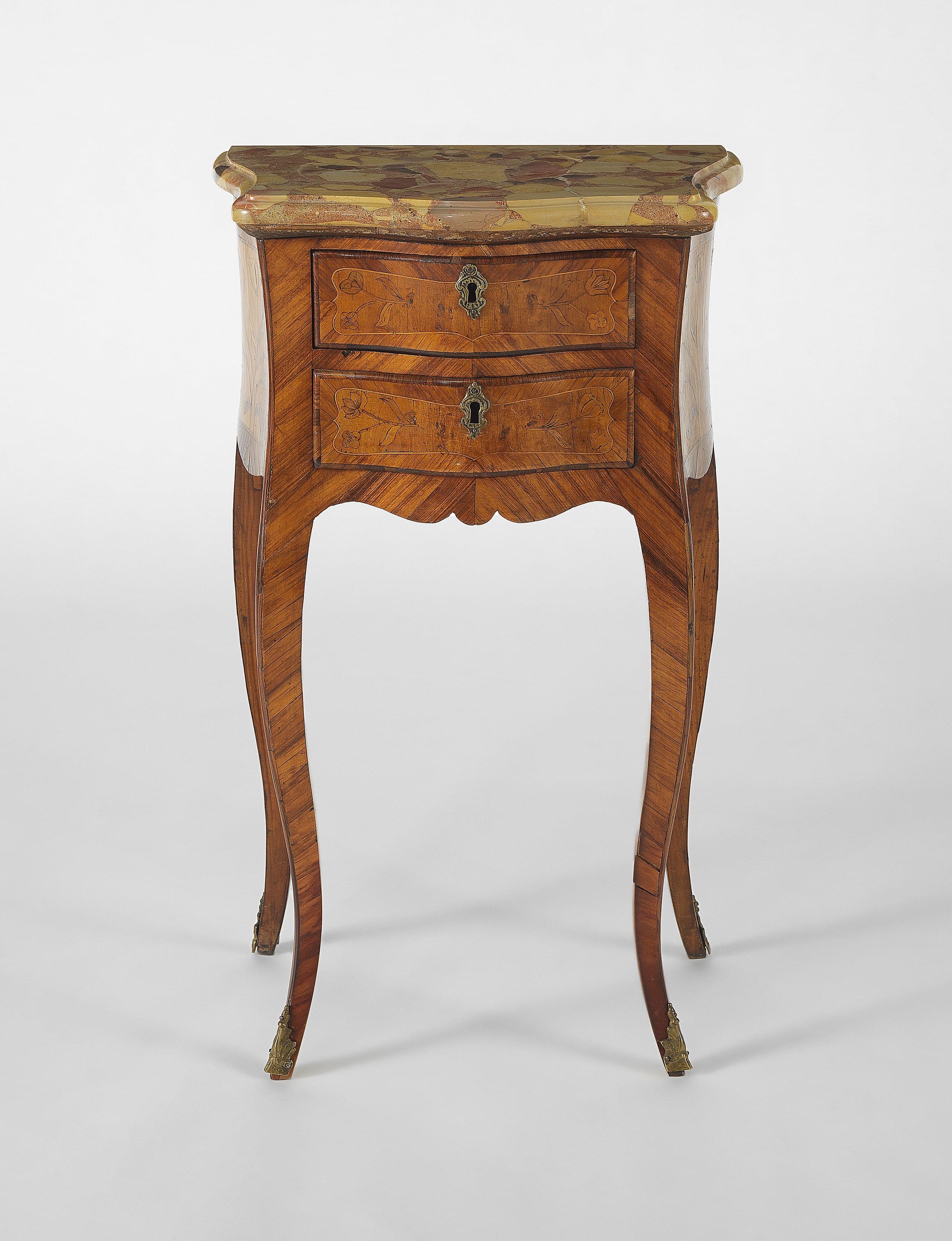 Deux tiroirs, placage de bois de rose à décor de fleurs, dessus de marbre brèche d'Alep, 74x43x29 cm. Provenance: Sophocle Venizelos (1894-1964), premier ministre de Grèce 1944-1961