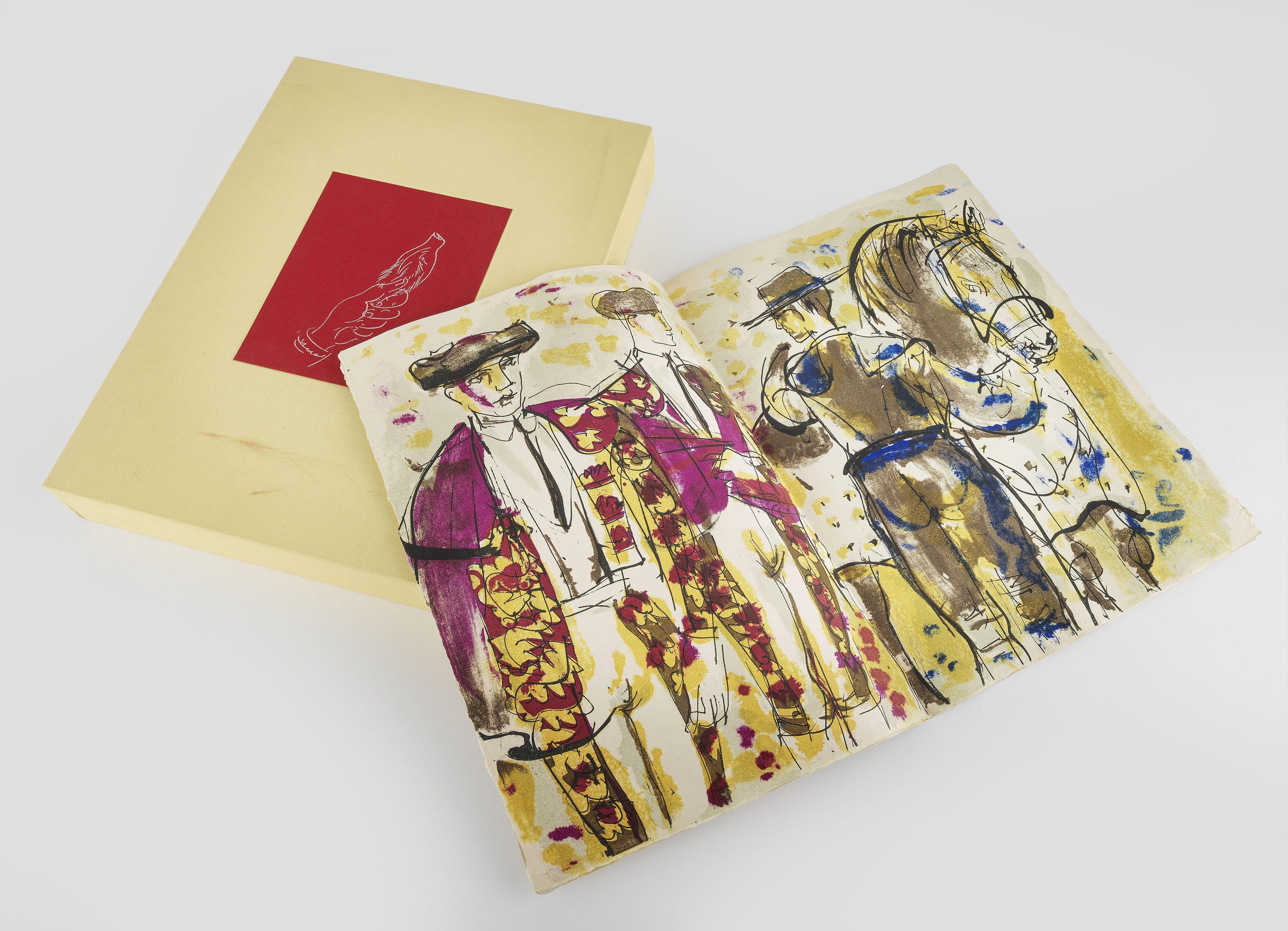 In folio en feuilles, couverture de papier ivoire avec un beau motif repoussé, coffret de toile jaune. Edition illustrée de cinq lithographies en couleurs à double page et de lithographies en noir dans le texte. Tirage limité à 250 exemplaires, un des quelques exemplaires H.C. Bel envoi sur le faux-titre orné d’un dessin à l’encre rouge signé.