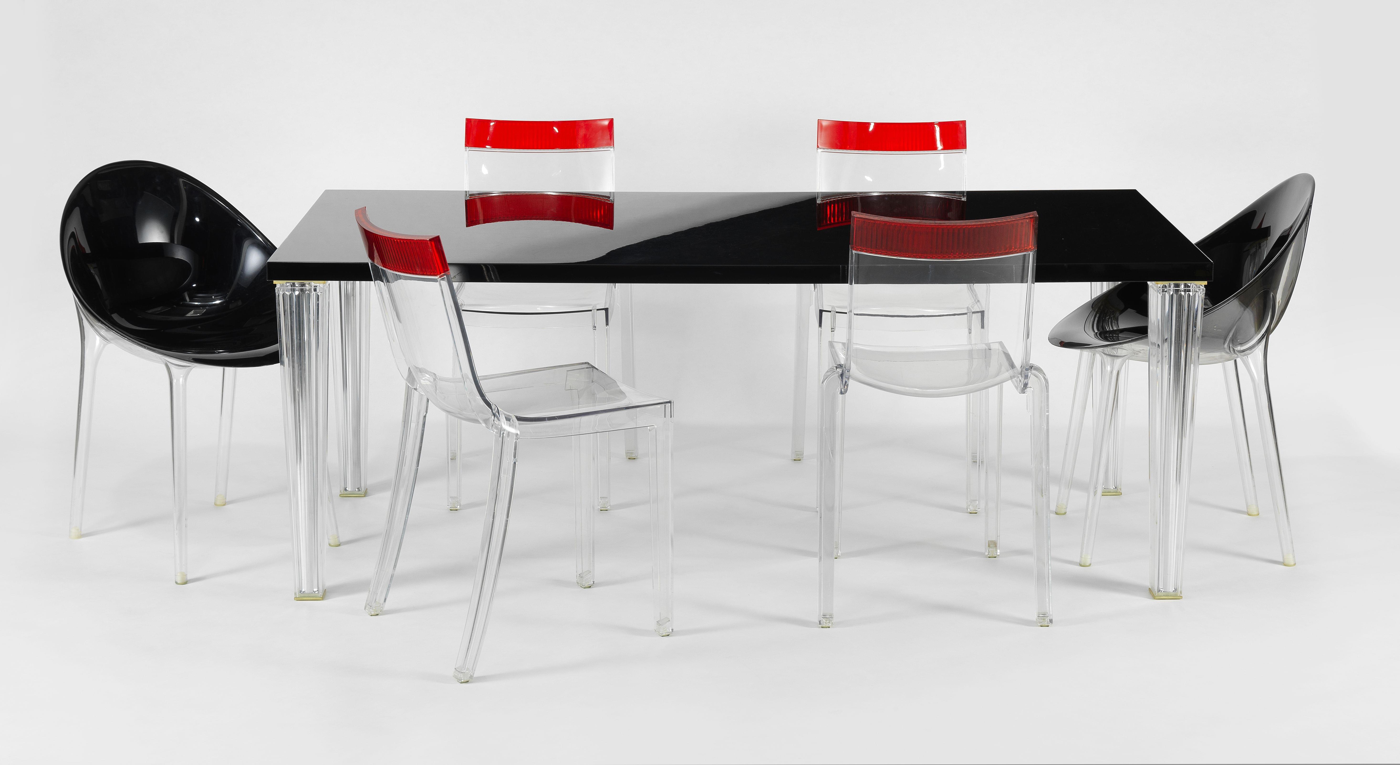 Table de salle à manger Top Top, édition Kartell, polyester noir et polycarbonate, 72x190x90 cm. On joint quatre chaises et deux fauteuils, pvc transparent, rouge et noir.