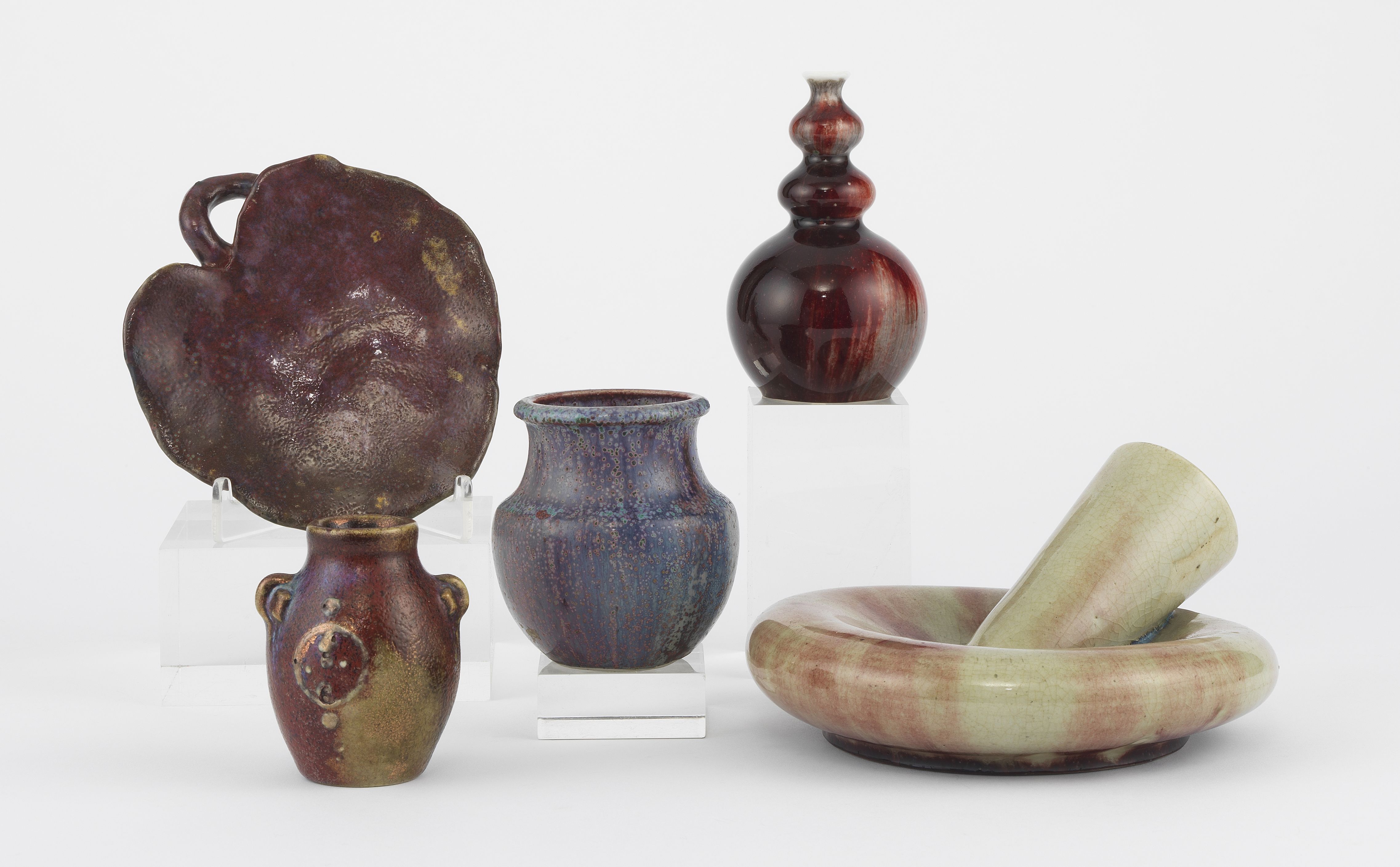 Grès émaillé aubergine et flambé, H de 7 à 11 cm. Provenance: Le...