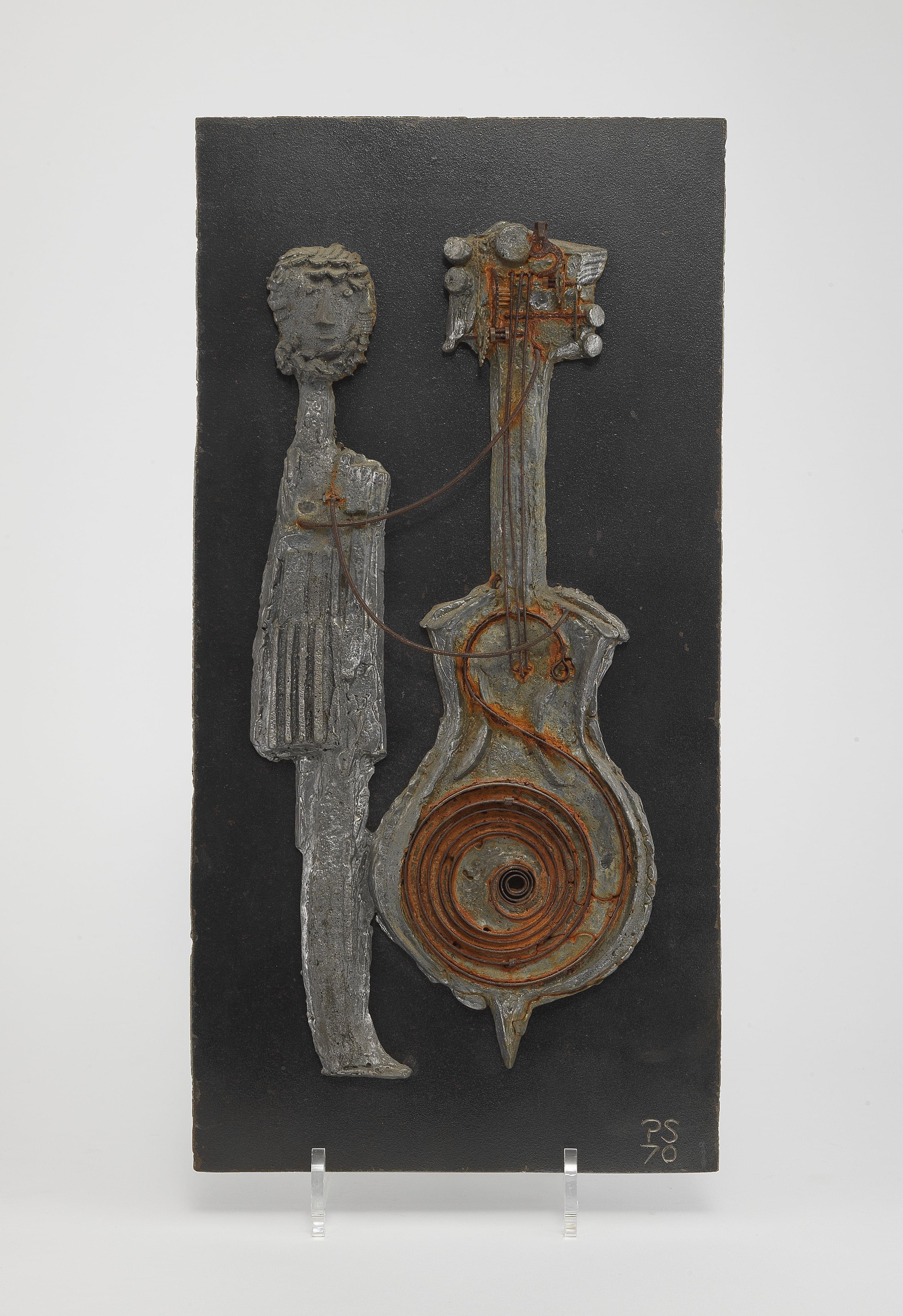 Plaque rectangulaire figurant un personnage à l'instrument à corde, monogrammée et datée 70, 42x21 cm