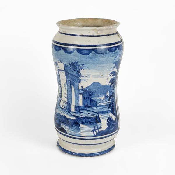 4470. Pot à pharmacie à décor d'un paysage, daté 1734